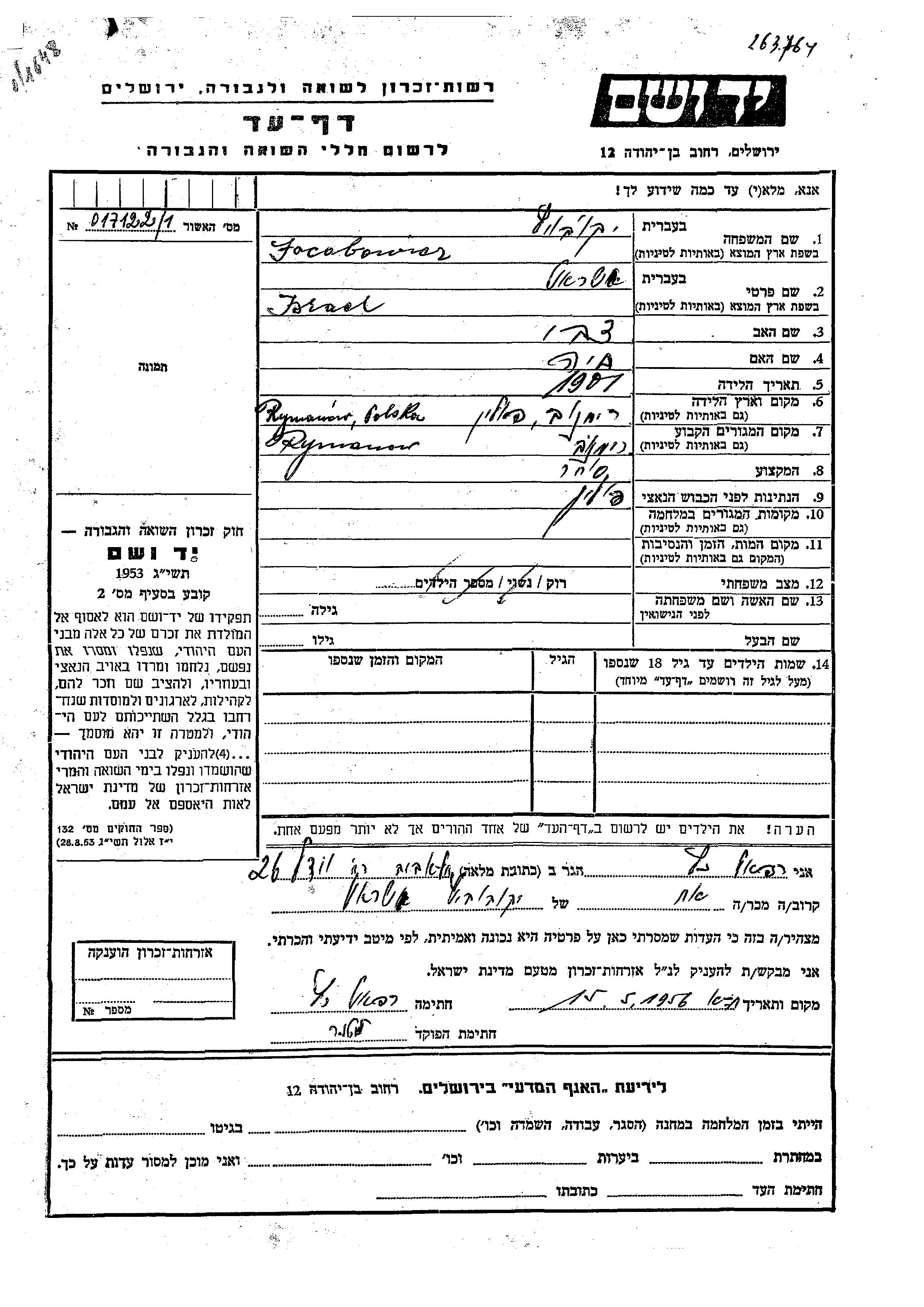Israel Jacobowicz wurde im Jahr 1901 in Rymanow, Polen geboren. Er war der Sohn von Tzvi und Khaia. Er war Kaufmann/-frau und Ledig. Vor dem Zweiten Weltkrieg lebte er in Rymanow, Polen.