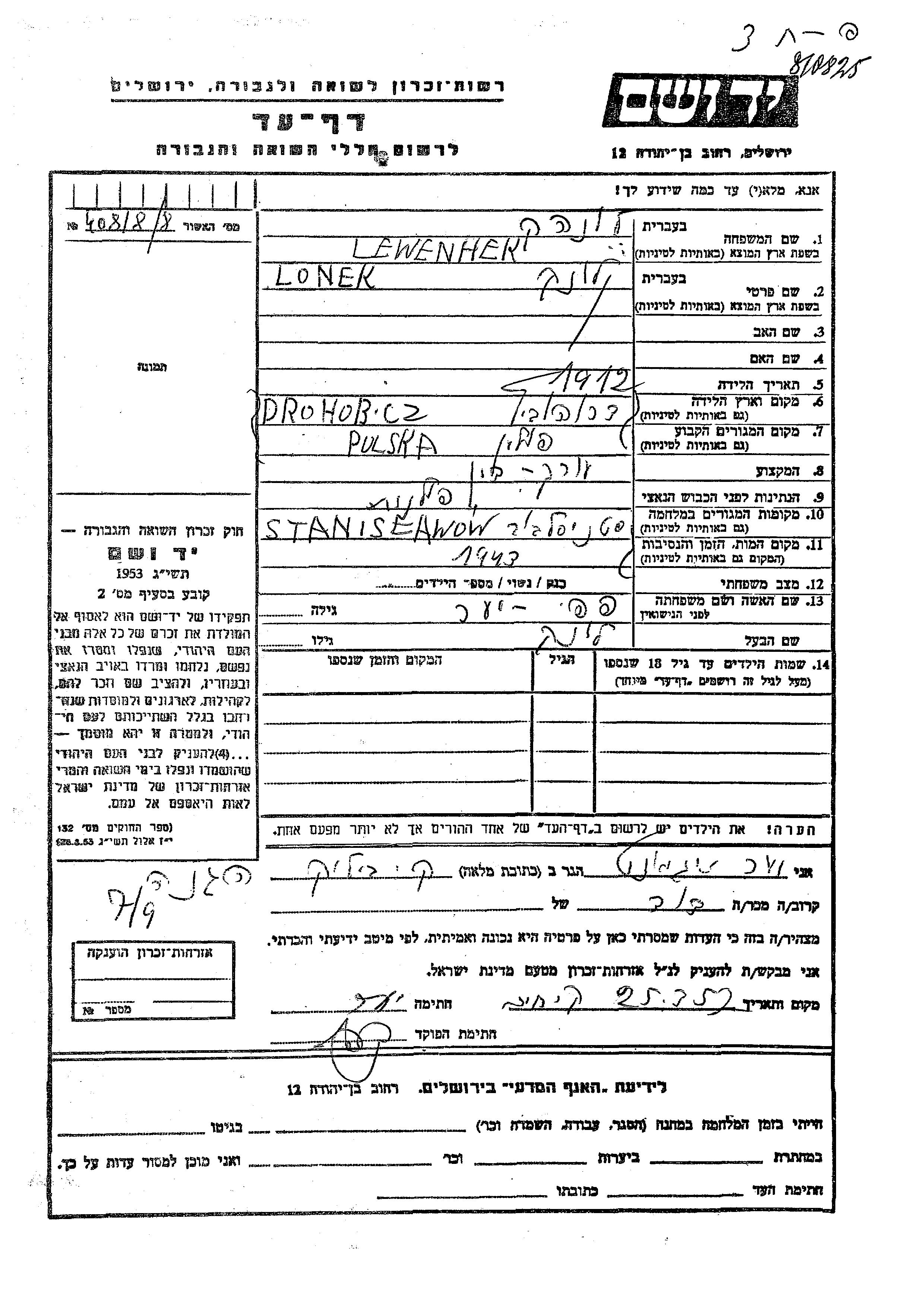 Lonek Lewenhek wurde im Jahr 1912 in Drohobicz, Polen geboren. Er war Rechtsanwalt/rechtsanwältin und mit Pesi, geb. Iar Verheiratet. Vor dem Zweiten Weltkrieg lebte er in Drohobicz, Polen. Während des Krieges war er in Stanislawow, Polen.
