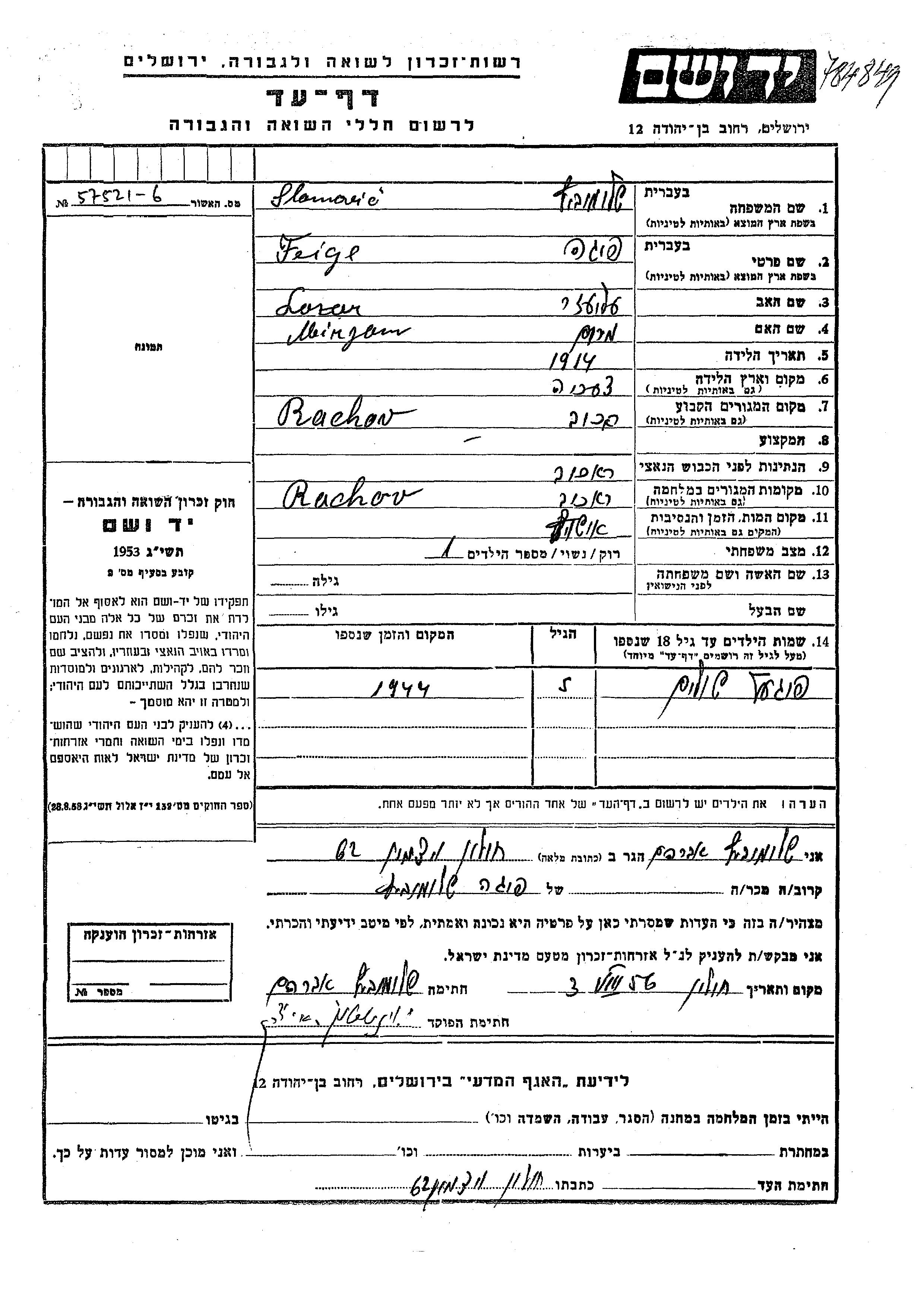 Feiga Slomovic wurde im Jahr 1914 in Tschechoslowakei geboren. Sie war die Tochter von Lazer und Miryam. Sie war Verheiratet. Vor dem Zweiten Weltkrieg lebte sie in Rachow, Polen. Während des Krieges war sie in Rachov.