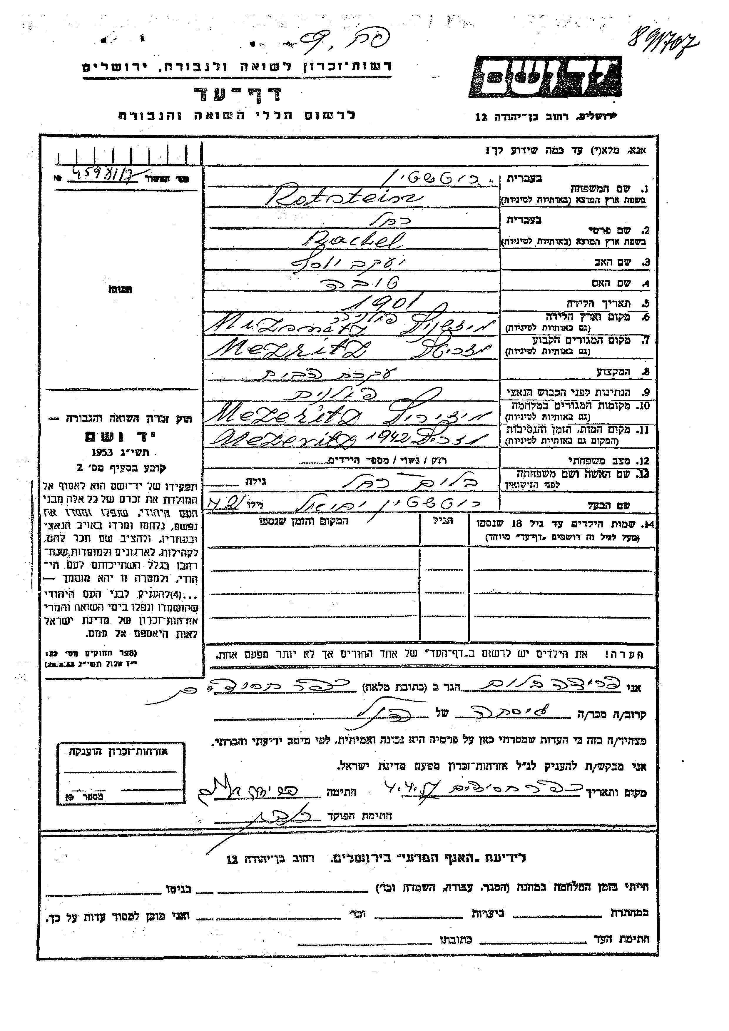 Rachel Rotstein, geb. Blum wurde im Jahr 1901 in Mezeric, Polen geboren. Sie war die Tochter von Yaakov Yosef und Tova. Sie war Hausfrau und mit Yekhiel Verheiratet. Vor dem Zweiten Weltkrieg lebte sie in Mezeric, Polen. Während des Krieges war sie in Mezeric, Polen.
