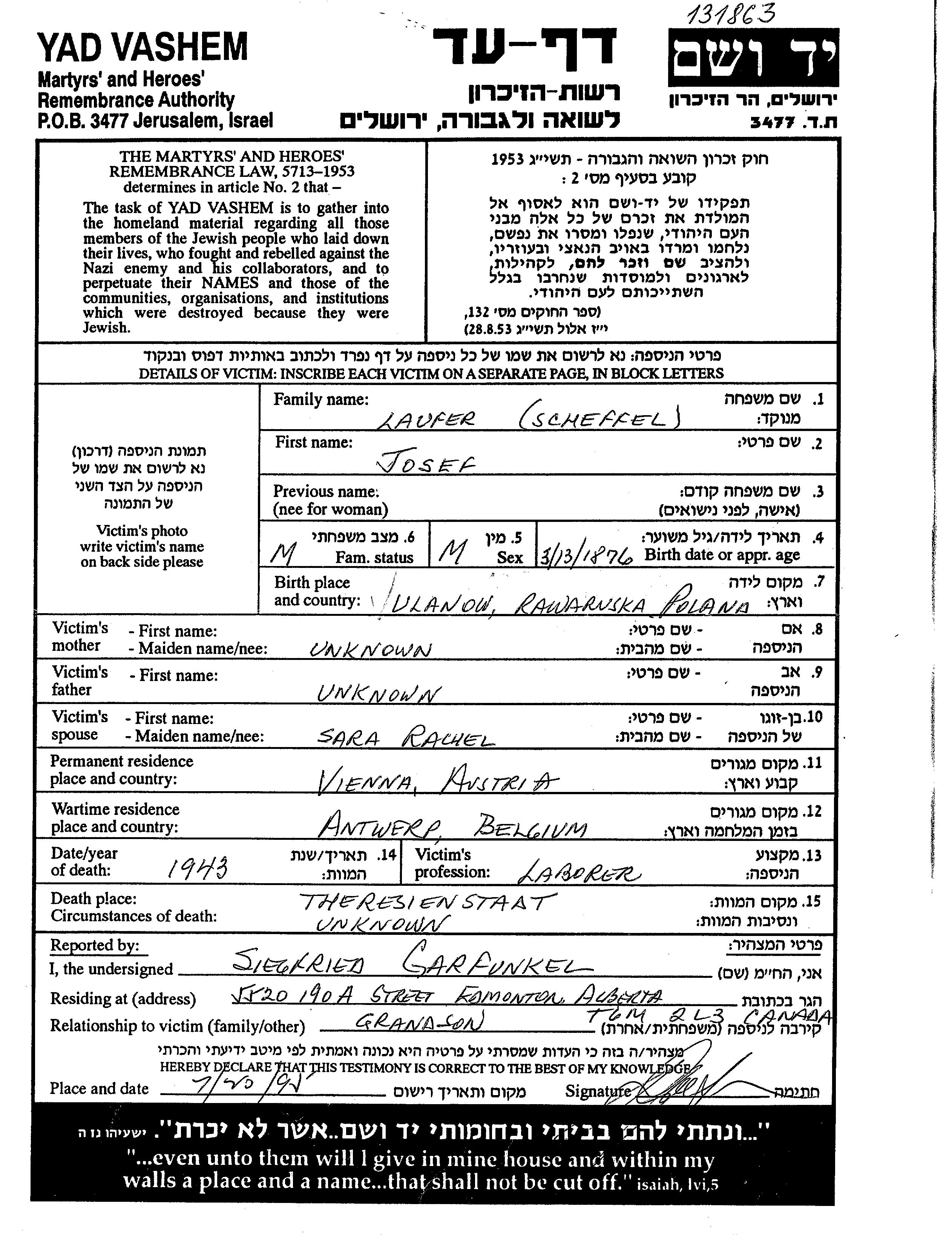 Josef Scheffel Laufer wurde im Jahr 1876 in Ulanow, Polen geboren. Er war Arbeiter/-in und mit Rachel Sara Verheiratet. Vor dem Zweiten Weltkrieg lebte er in Wien, Österreich. Während des Krieges war er in Antwerpen, Belgien.