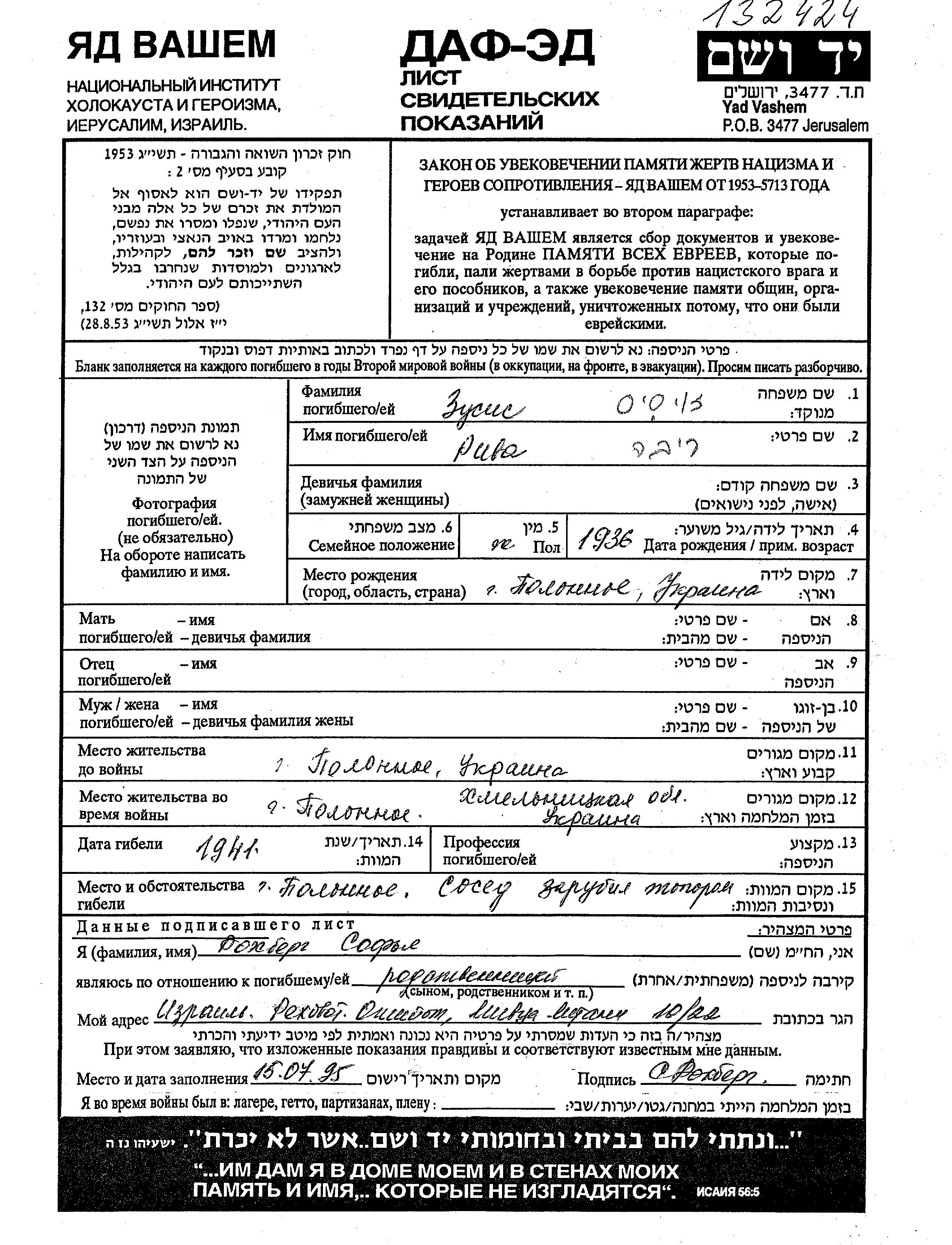 Riva wurde in der Schoah ermordet. Todesort: Polonnoye, Ukraine (UdSSR) im Jahr 1941.