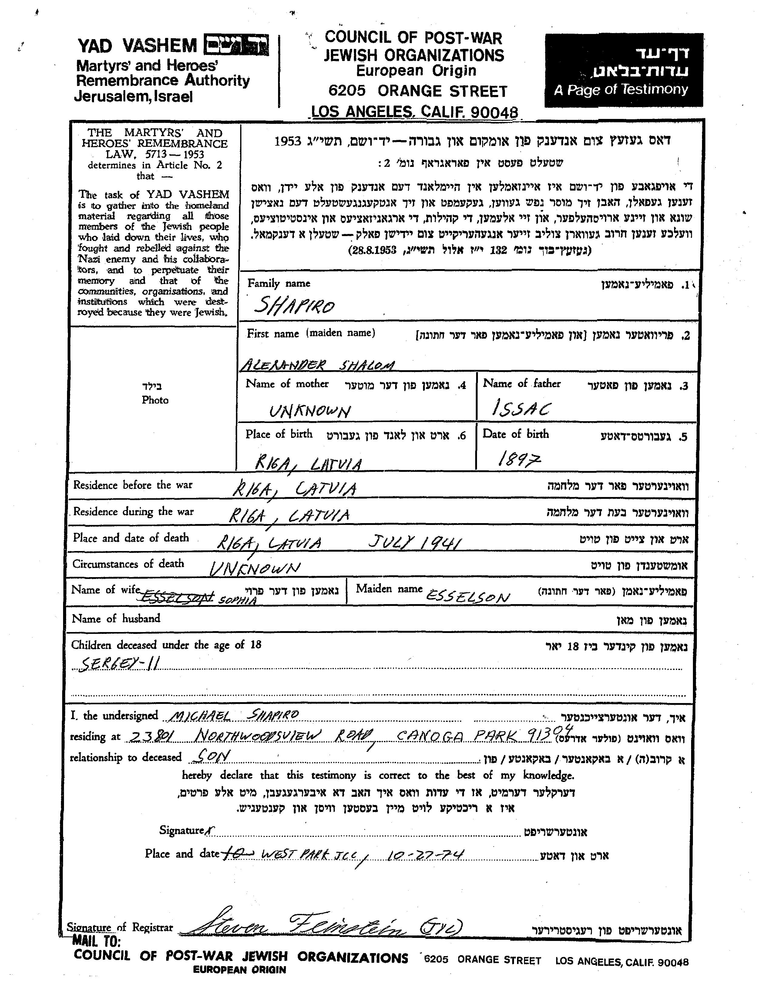 Alexander Shalom Shapiro wurde im Jahr 1897 in Riga, Lettland geboren. Er war der Sohn von Issac. Er war mit Sophia, geb. Esselson Verheiratet. Vor dem Zweiten Weltkrieg lebte er in Riga, Lettland. Während des Krieges war er in Riga, Lettland.