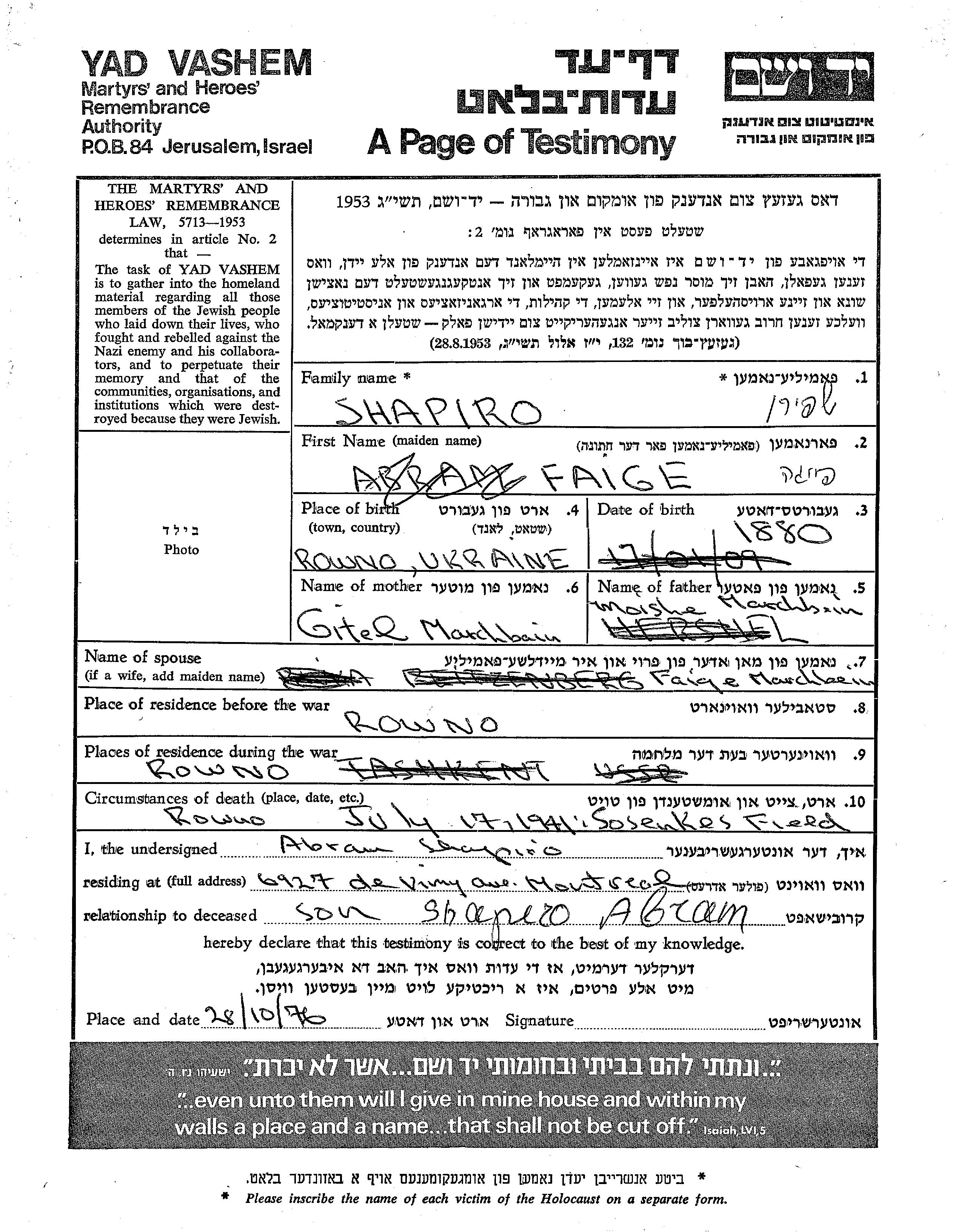 Faige Shapiro, geb. Marchbein wurde im Jahr 1880 in Rowne, Polen geboren. Sie war die Tochter von Moishe und Gitel. Vor dem Zweiten Weltkrieg lebte sie in Rowne, Polen. Während des Krieges war sie in Rowne, Polen.