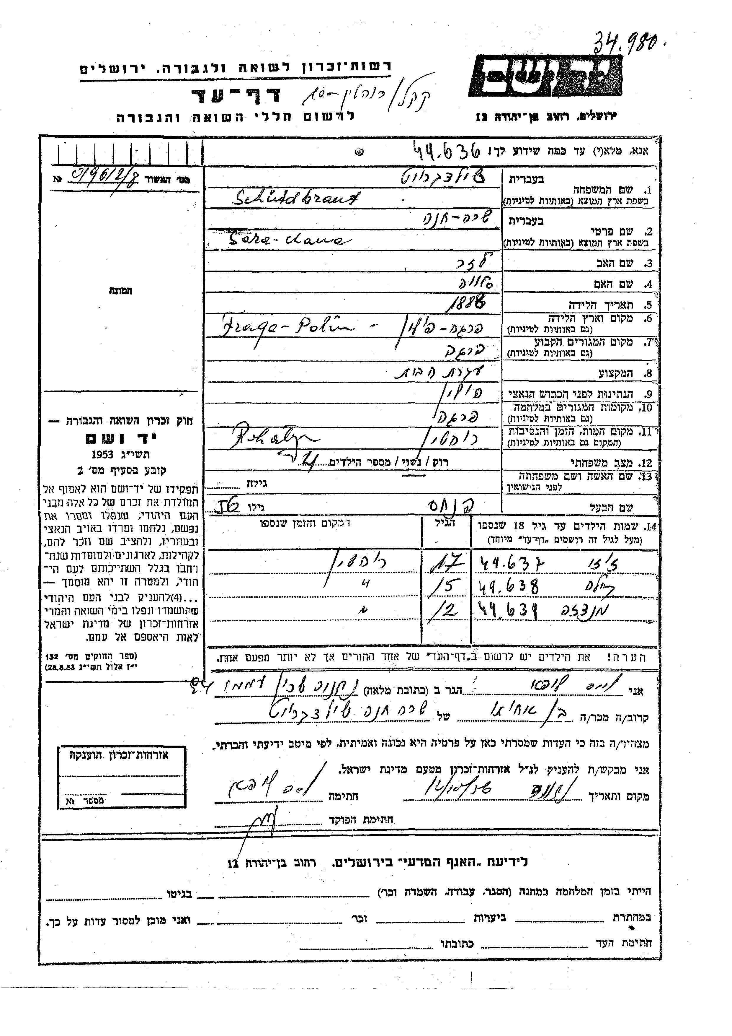 Chana Sara Schildkraut wurde im Jahr 1888 in Fraga, Polen geboren. Sie war die Tochter von Lazar und Eva. Sie war Hausfrau und mit Pinkhas Verheiratet. Vor dem Zweiten Weltkrieg lebte sie in Fraga, Polen. Während des Krieges war sie in Fraga, Polen.