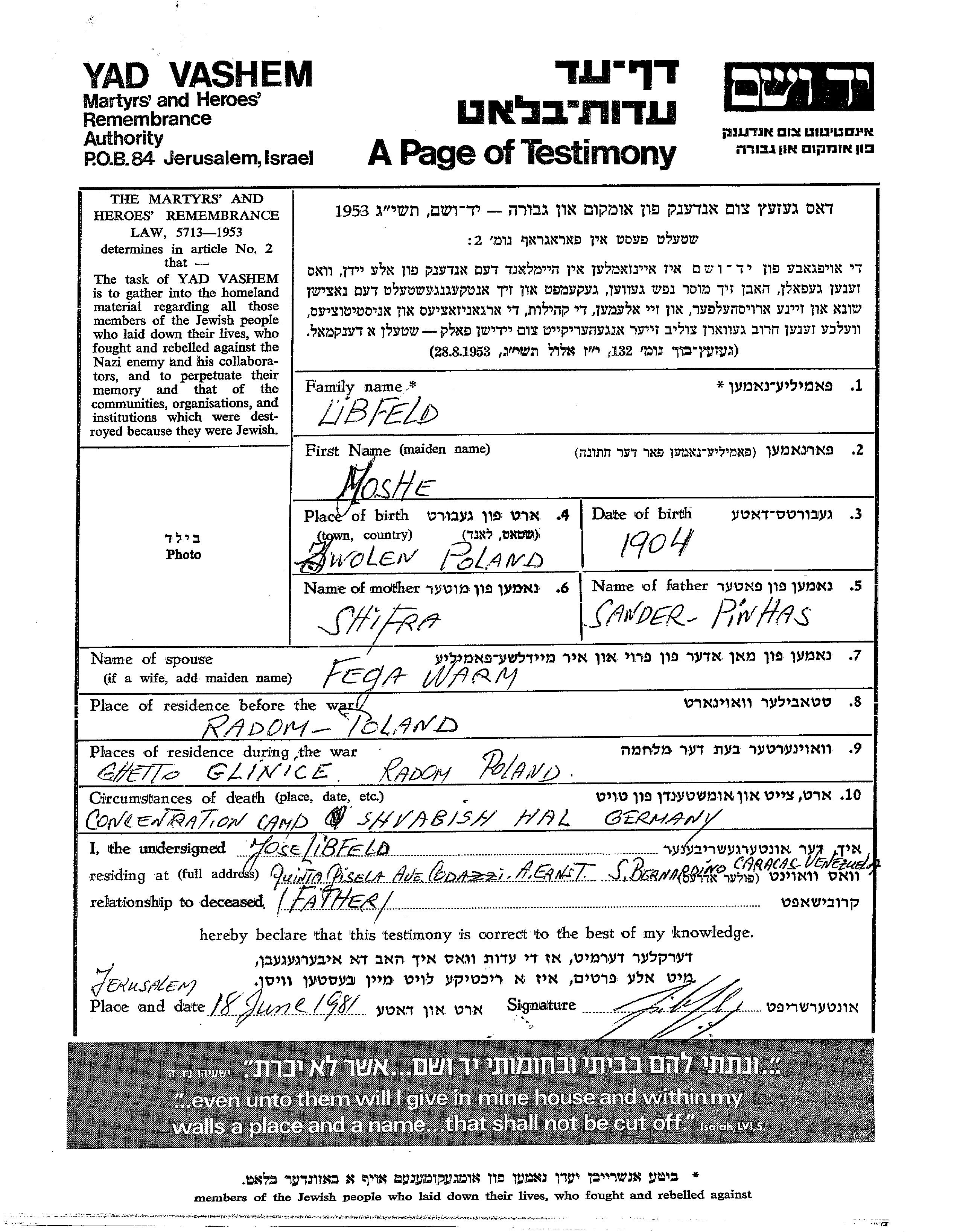 Moshe Libfeld wurde im Jahr 1904 in Zwolen, Polen geboren. Er war der Sohn von Sender Pinhas und Shifra. Vor dem Zweiten Weltkrieg lebte er in Radom, Polen. Während des Krieges war er in Glinice, Polen.