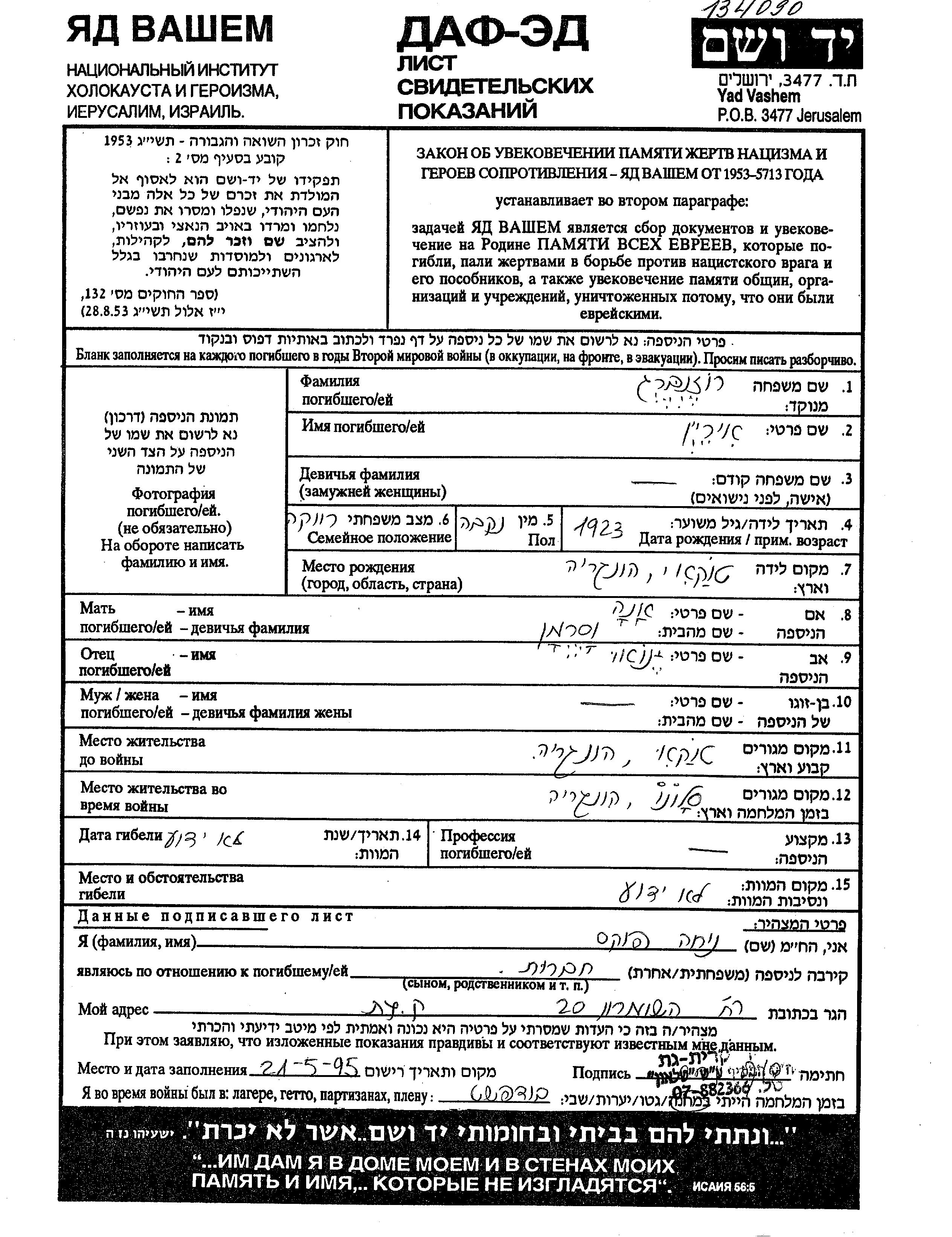 Iren Rozenberg wurde im Jahr 1923 in Tokaj, Ungarn geboren. Sie war die Tochter von Yona und Ana, geb. Vaserman. Sie war Ledig. Vor dem Zweiten Weltkrieg lebte sie in Tokaj, Ungarn. Während des Krieges war sie in Szalonna, Ungarn.