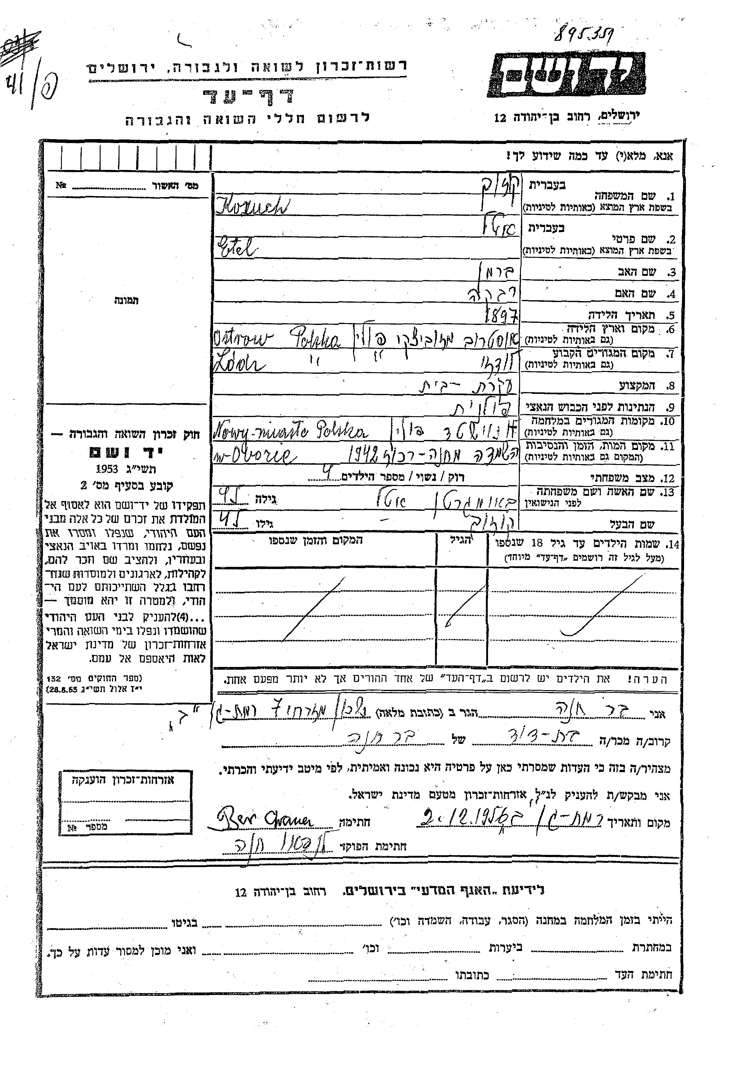 Etel Kozuch, geb. Baumgarten wurde im Jahr 1897 in Ostrów Mazowiecka, Polen geboren. Sie war die Tochter von Berman und Rivka. Sie war Hausfrau und Verheiratet. Vor dem Zweiten Weltkrieg lebte sie in Lodz, Polen. Während des Krieges war sie in Nowe Miasto, Polen.