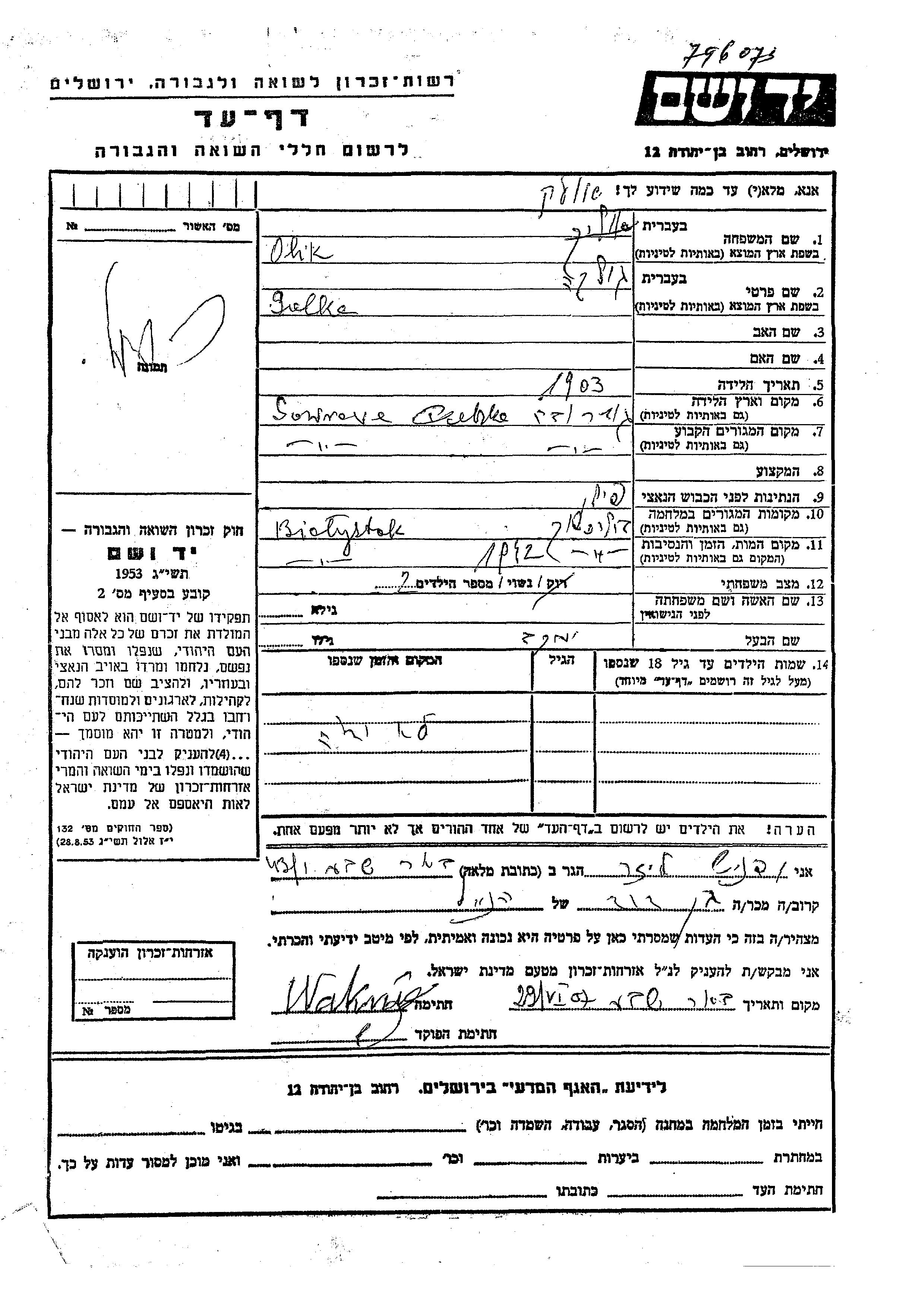 Gulka Olik wurde im Jahr 1903 in Gowrowa, Polen geboren. Sie war mit Yaakov Verheiratet. Vor dem Zweiten Weltkrieg lebte sie in Gowrowa, Polen. Während des Krieges war sie in Bialystok, Polen.