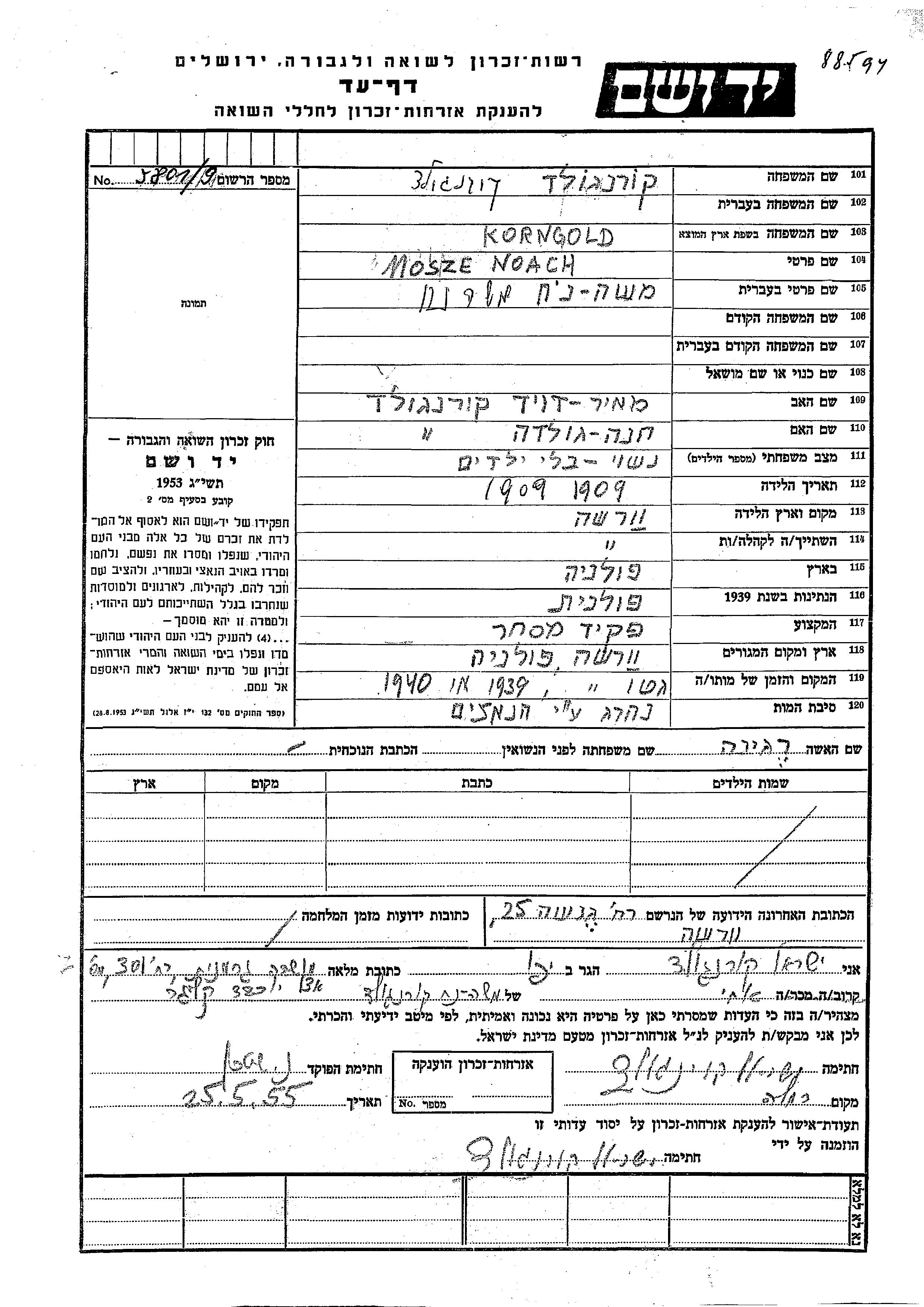 Mosze Noach Korngold wurde im Jahr 1909 in Warszawa, Polen geboren. Er war der Sohn von Meir David und Khana Golda. Er war Handelsangestellter und mit Regina Verheiratet. Vor dem Zweiten Weltkrieg lebte er in Warszawa, Polen. Während des Krieges war er in Warszawa, Polen.