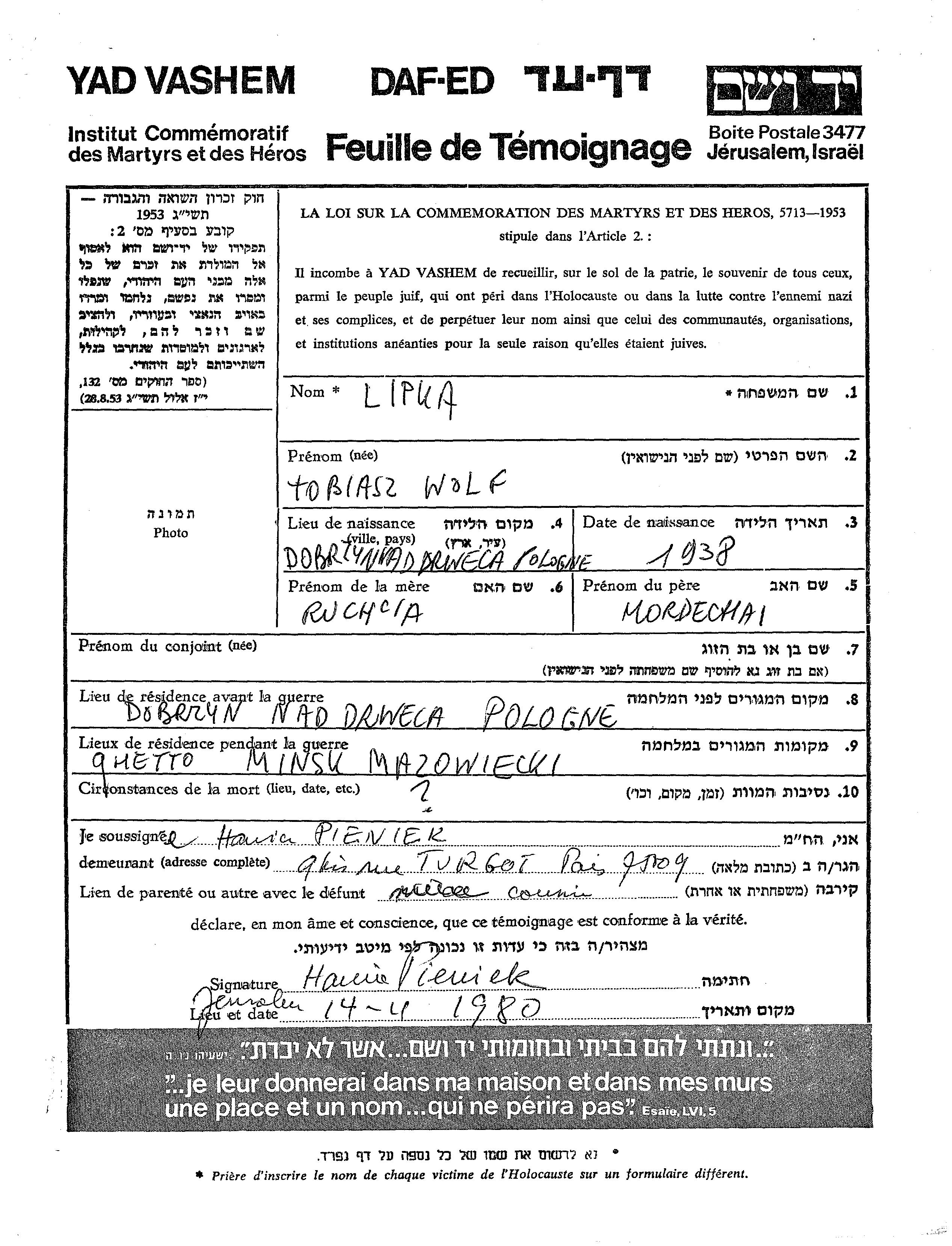 Tobiasz Wolf Lipka wurde im Jahr 1938 in Dobrzyn nad Drweca, Polen geboren. Er war der Sohn von Mordechai und Ruchcia. Vor dem Zweiten Weltkrieg lebte er in Dobrzyn nad Drweca, Polen. Während des Krieges war er in Minsk Mazowiecki, Polen.