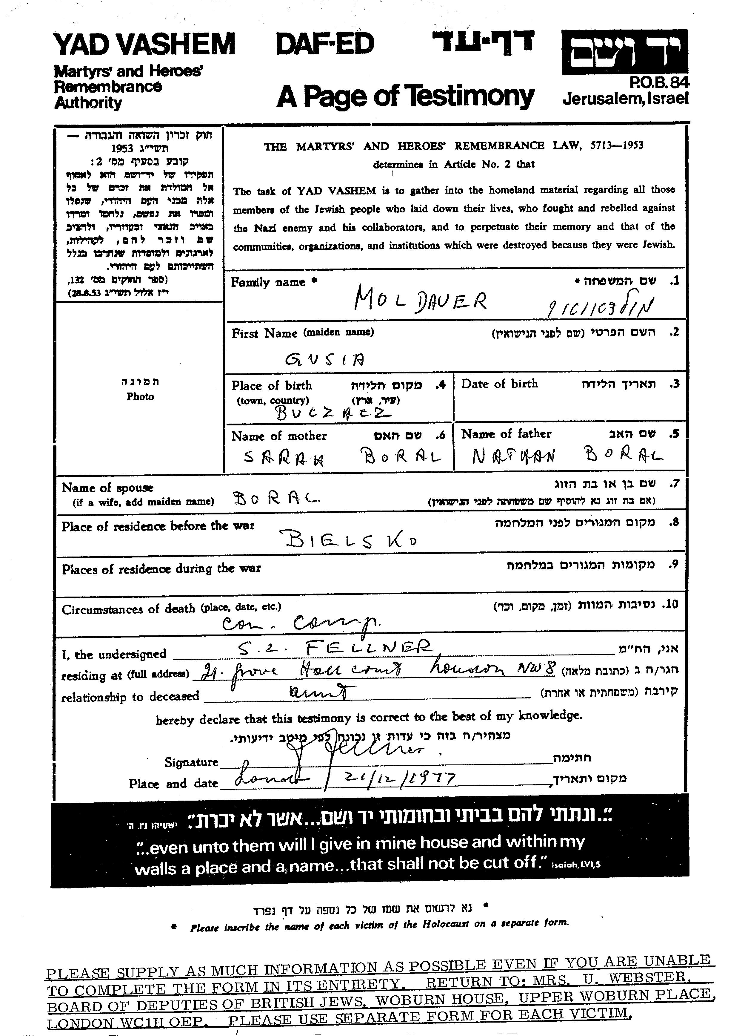 Gusia Moldauer, geb. Boral wurde in Buczacz, Polen geboren. Sie war die Tochter von Nataan und Sarah. Sie war Verheiratet. Während des Krieges war sie in Bielsko, Polen.