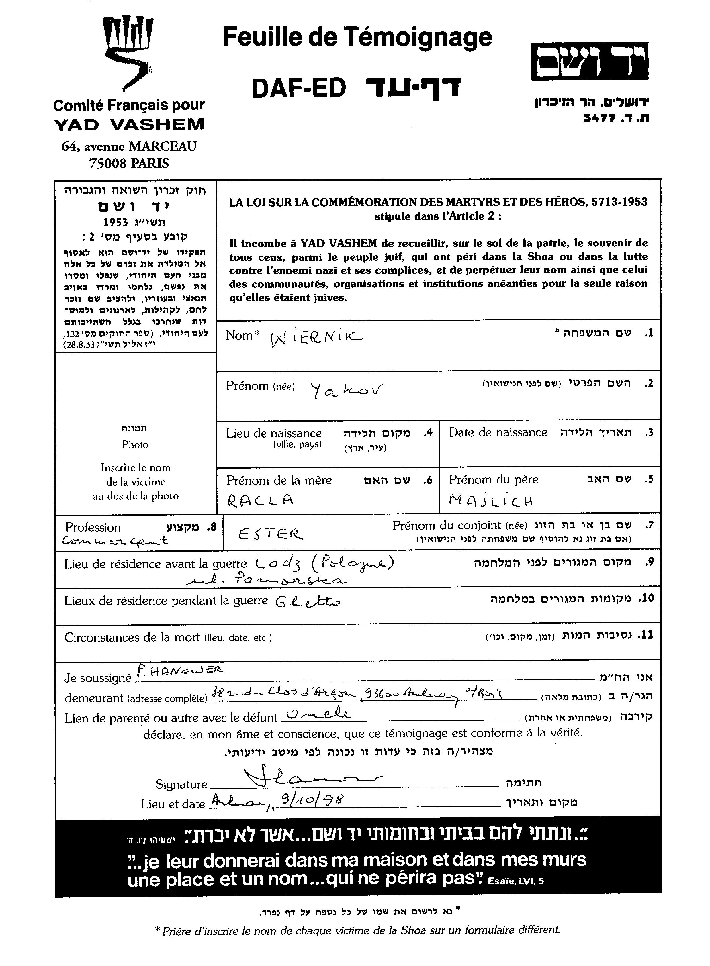 Yakov Wiernik wurde Er war der Sohn von Majlich und Ralla. Vor dem Zweiten Weltkrieg lebte er in Lodz, Polen. Während des Krieges war er in Getto.