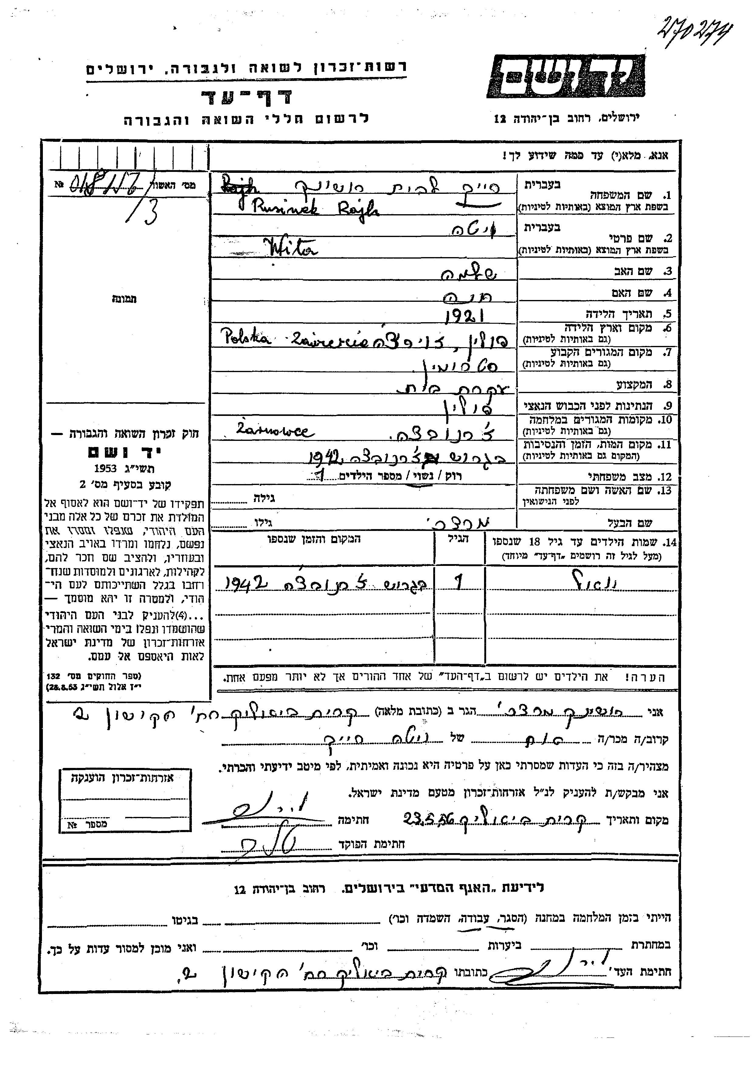 Wita Rajh, geb. Rusinek wurde im Jahr 1921 in Zawierce, Polen geboren. Sie war die Tochter von Shlomo und Khana. Sie war Hausfrau und mit Mordekhai Verheiratet. Vor dem Zweiten Weltkrieg lebte sie in Strumien, Polen. Während des Krieges war sie in Zarnowiec, Polen.