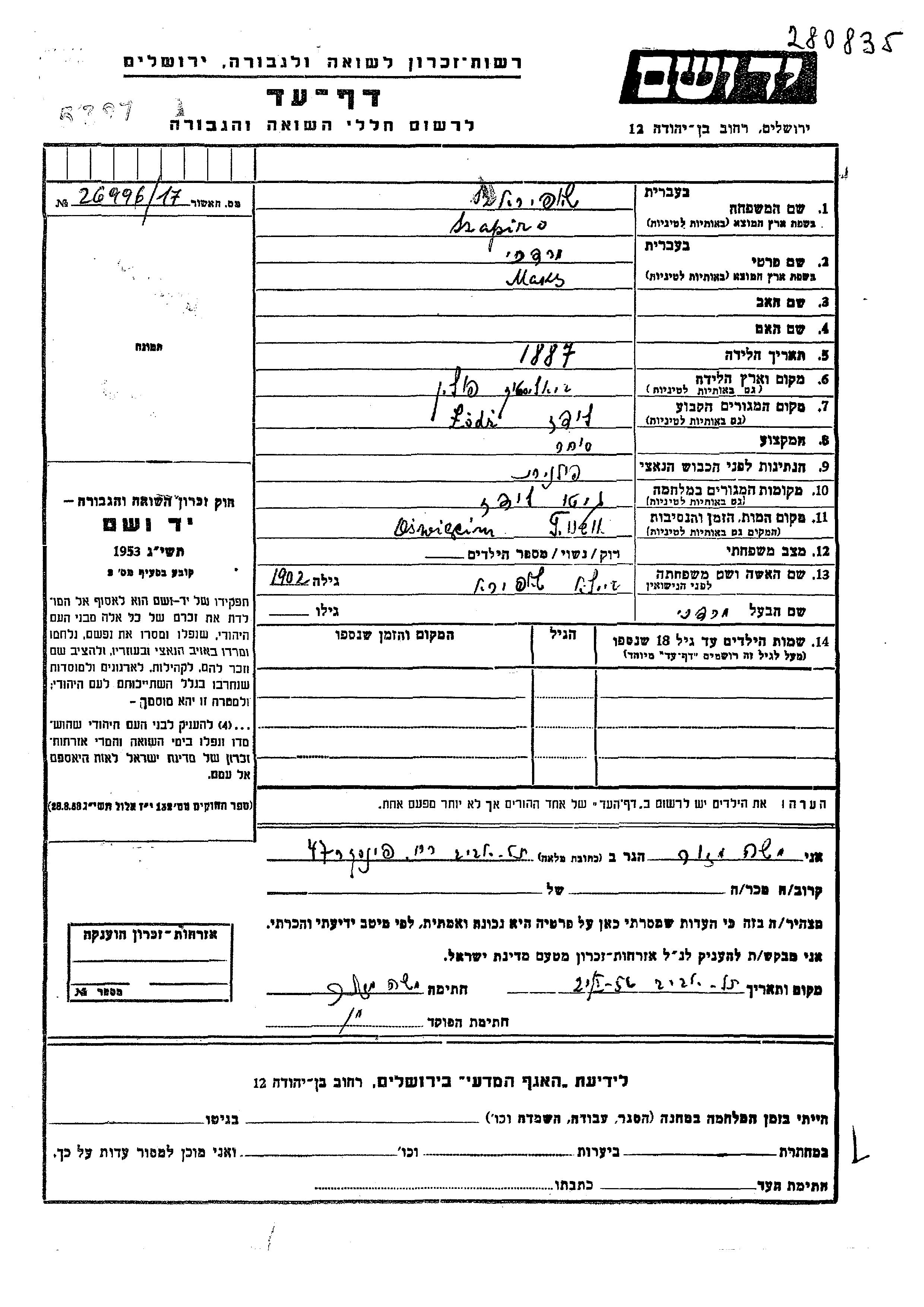 Max Mordekhai Szapiro wurde im Jahr 1887 in Bialystok, Polen geboren. Er war Kaufmann/-frau. Vor dem Zweiten Weltkrieg lebte er in Lodz, Polen. Während des Krieges war er in Lodz, Polen.