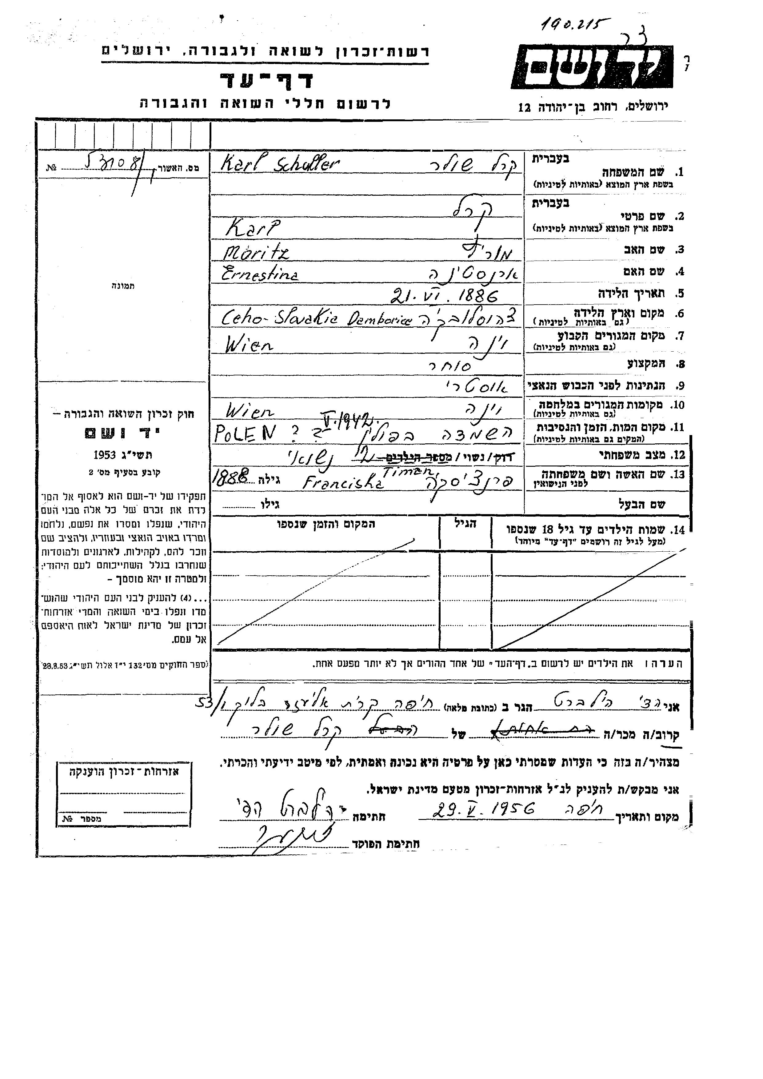 Karl Schuller wurde im Jahr 1886 in Tschechoslowakei geboren. Er war der Sohn von Moritz und Ernestina. Er war Kaufmann/-frau und mit Franciska, geb. Timan Verheiratet. Vor dem Zweiten Weltkrieg lebte er in Wien, Österreich. Während des Krieges war er in Wien, Österreich.