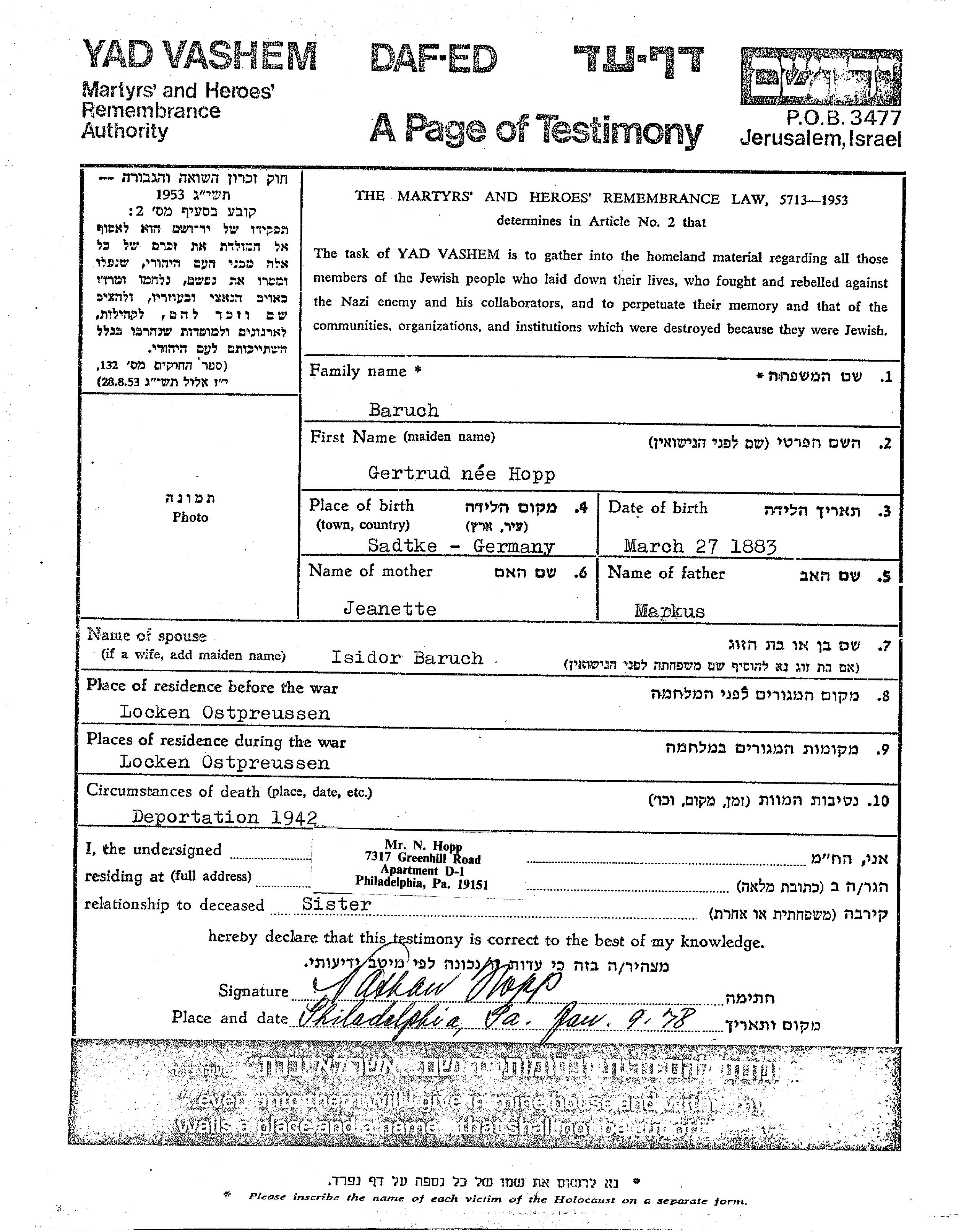 Gertrud Baruch, geb. Hopp wurde im Jahr 1883 in Deutsches Reich geboren. Sie war die Tochter von Markus und Jeanette. Sie war mit Isidor Verheiratet. Vor dem Zweiten Weltkrieg lebte sie in Locken, Deutsches Reich. Während des Krieges war sie in Locken, Deutsches Reich.