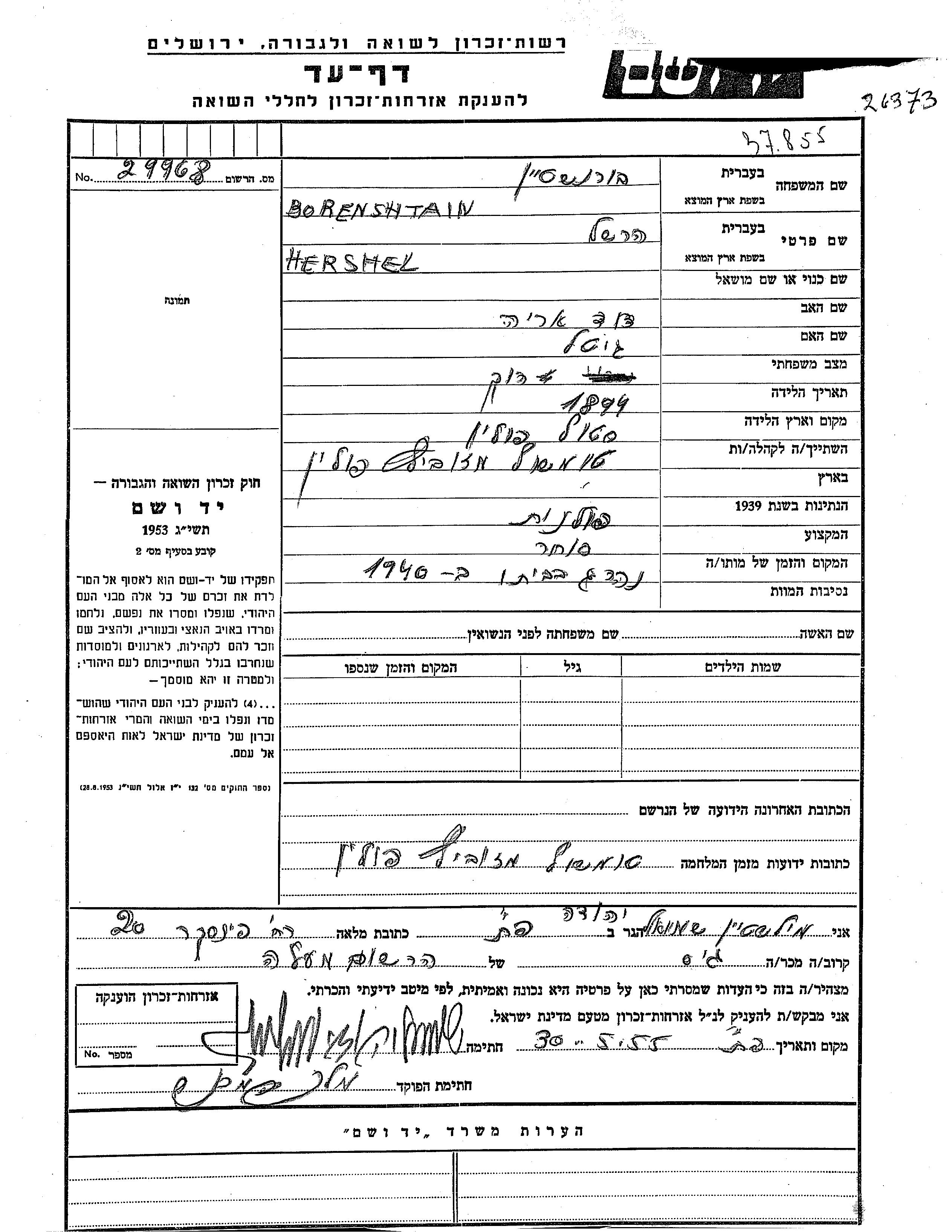 Hershel Borenshtain wurde im Jahr 1894 in Stol, Polen geboren. Er war der Sohn von David Arie und Gitel. Er war Kaufmann/-frau und Ledig. Vor dem Zweiten Weltkrieg lebte er in Tomaszow Mazowieckie, Polen. Während des Krieges war er in Polen.