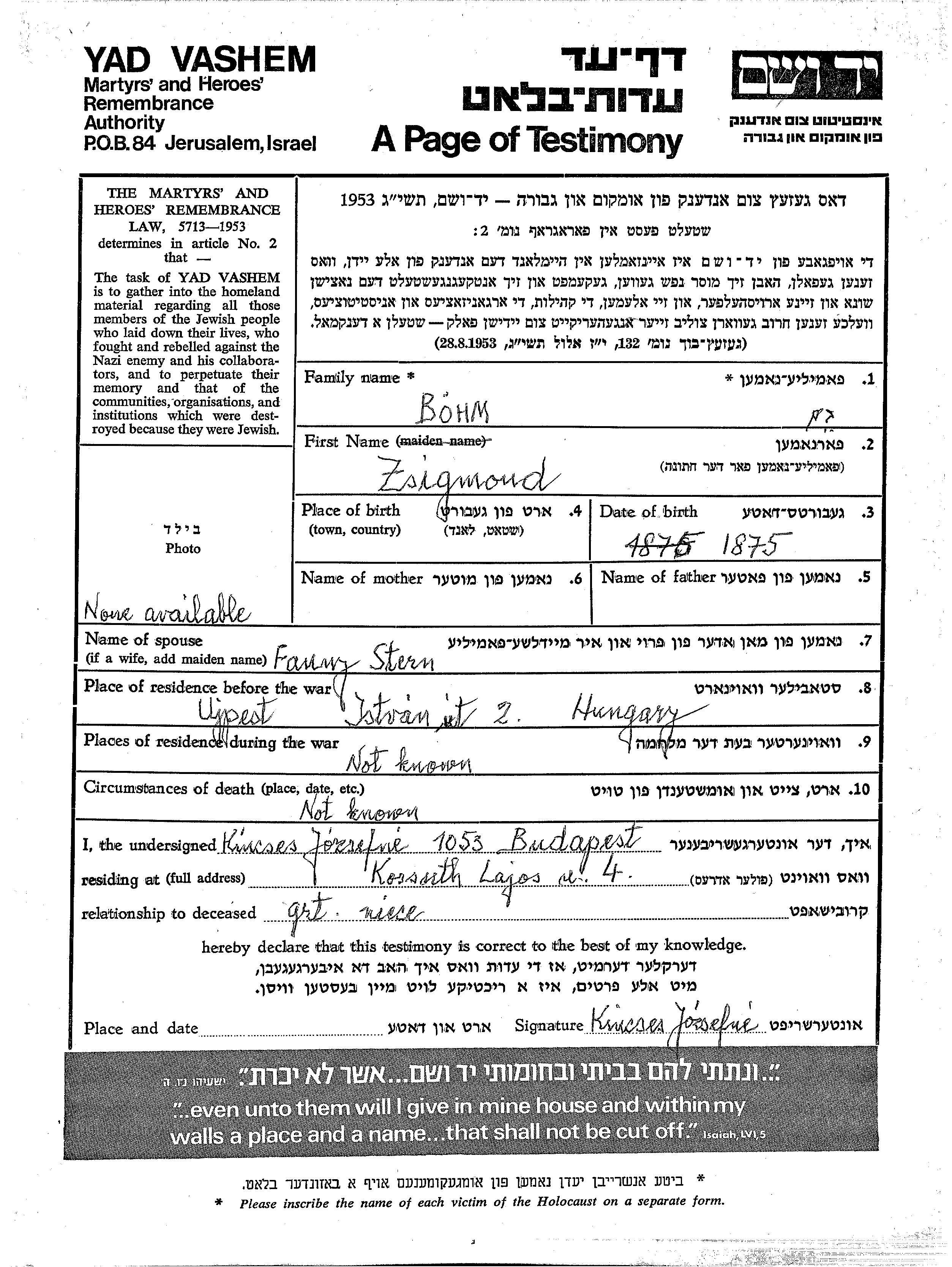 Zsigmond Bohm wurde im Jahr 1875 geboren. Er war mit Fanny, geb. Stern Verheiratet. Vor dem Zweiten Weltkrieg lebte er in Ujpest, Ungarn.