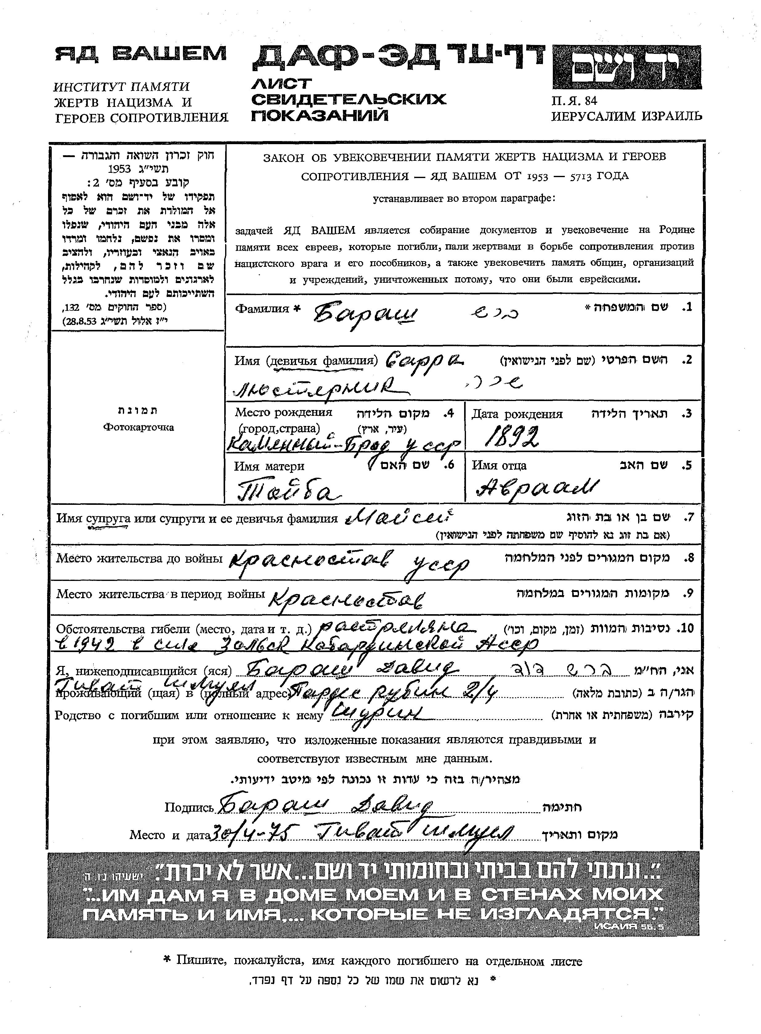 Barash Sara 1892 Krasnostav, Ukraine (UdSSR) Gedenkblatt