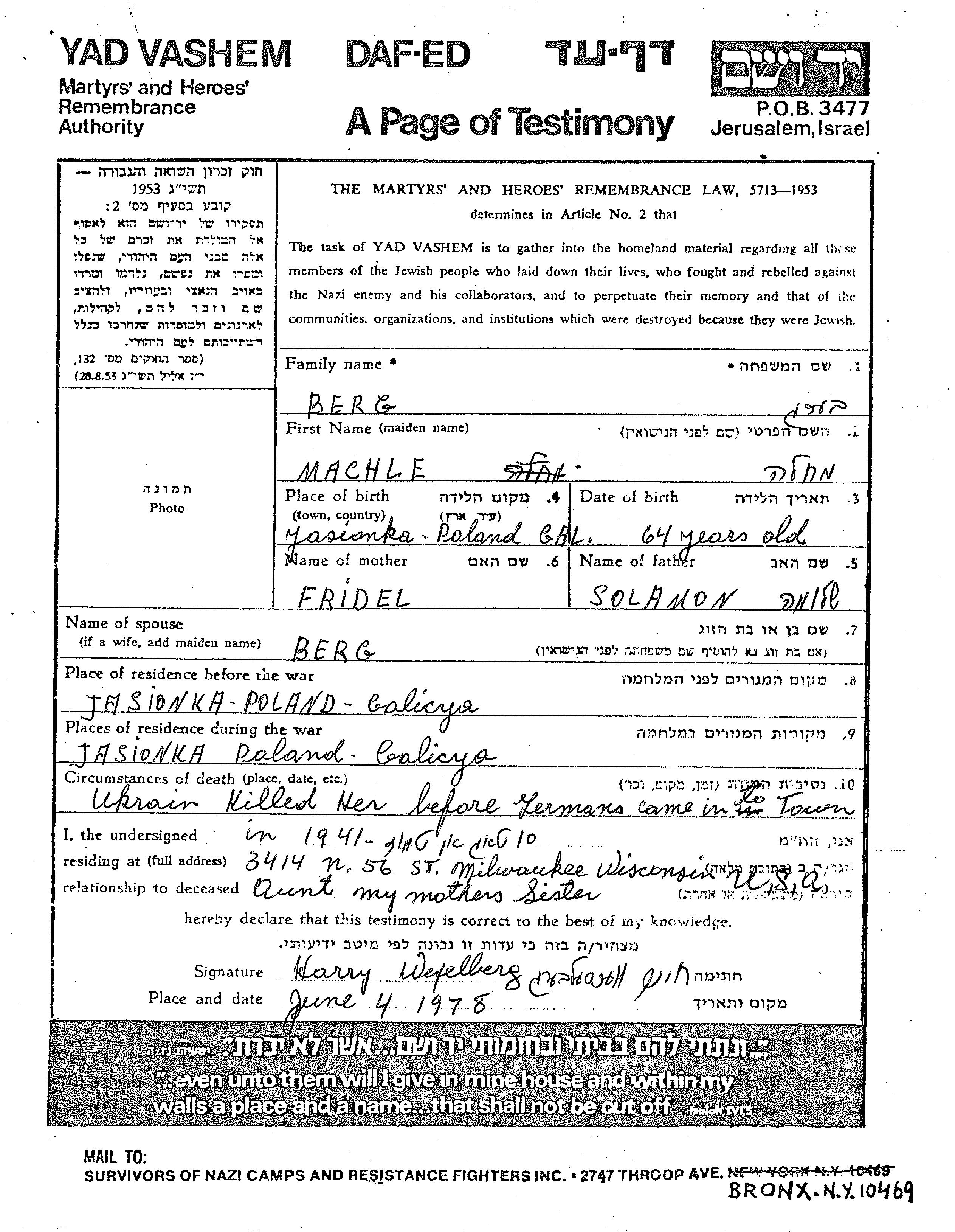 Machle Berg wurde in Jasionka, Polen geboren. Sie war die Tochter von Solamon und Fridl. Vor dem Zweiten Weltkrieg lebte sie in Jasionka, Polen. Während des Krieges war sie in Jasionka, Polen.
