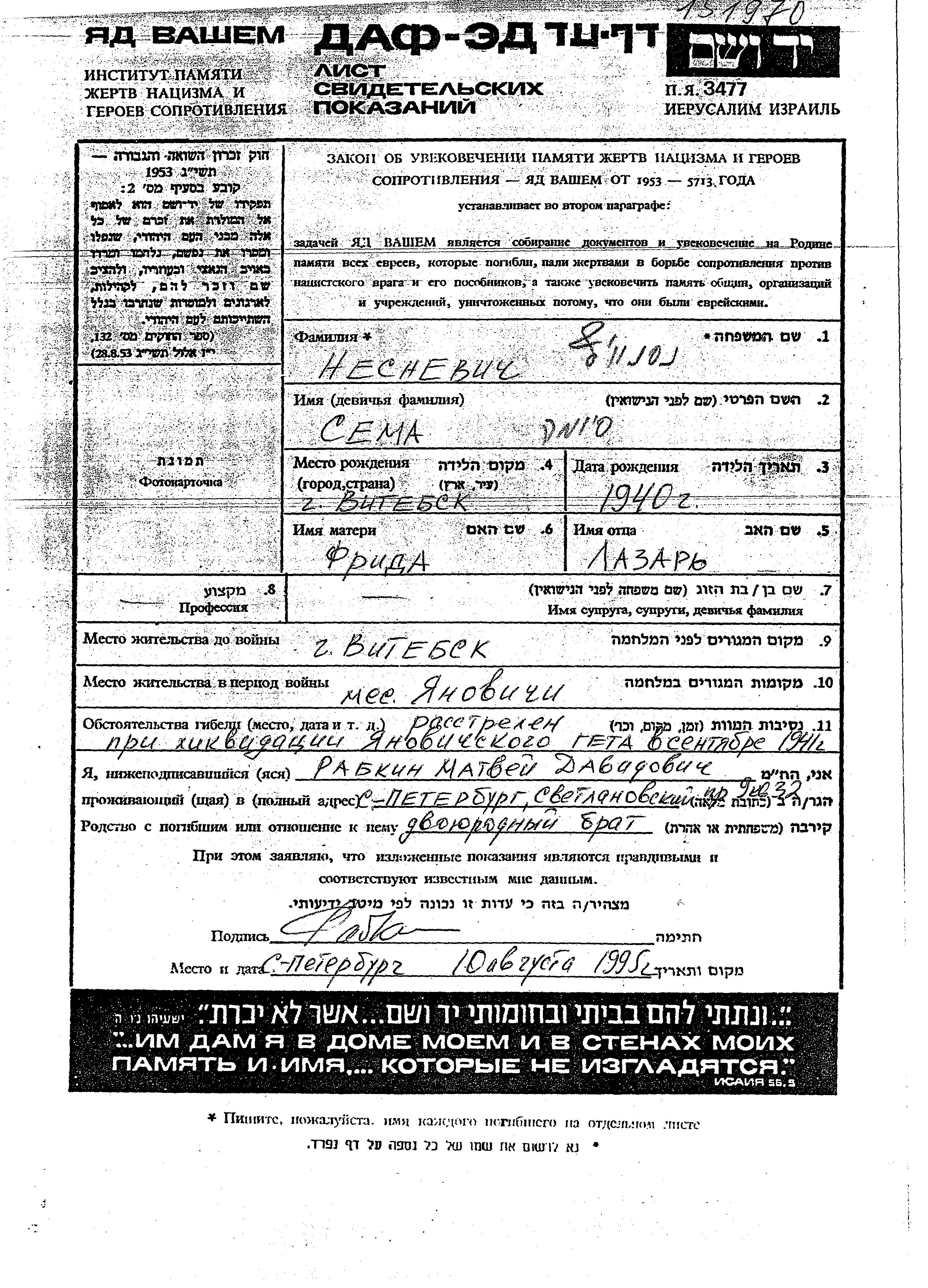 Sioma Nesnevich wurde im Jahr 1940 in Vitebsk, Weißrussland (UdSSR) geboren. Er war der Sohn von Lazar und Frida, geb. Ostrovski. Er war Kind. Vor dem Zweiten Weltkrieg lebte er in Vitebsk, Weißrussland (UdSSR). Während des Krieges war er in Yanovichi, Weißrussland (UdSSR).