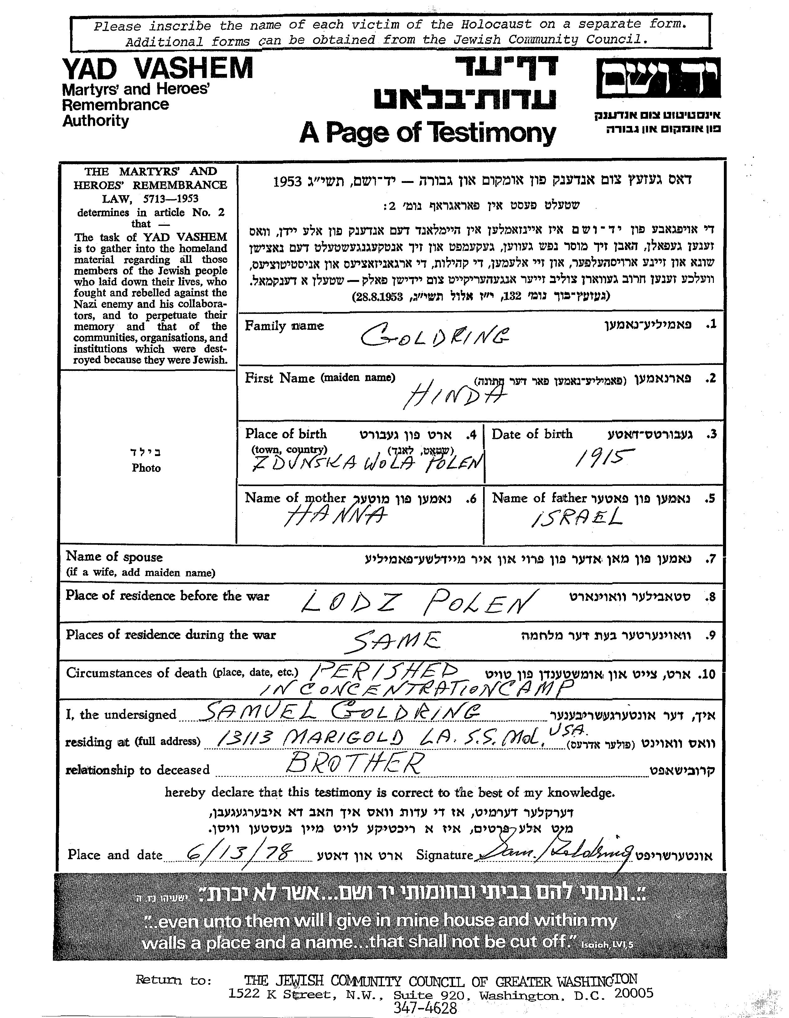 Hinda Goldring wurde im Jahr 1915 in Zdunska Wola, Polen geboren. Sie war die Tochter von Israel und Hanna. Vor dem Zweiten Weltkrieg lebte sie in Lodz, Polen. Während des Krieges war sie in Lodz, Polen.
