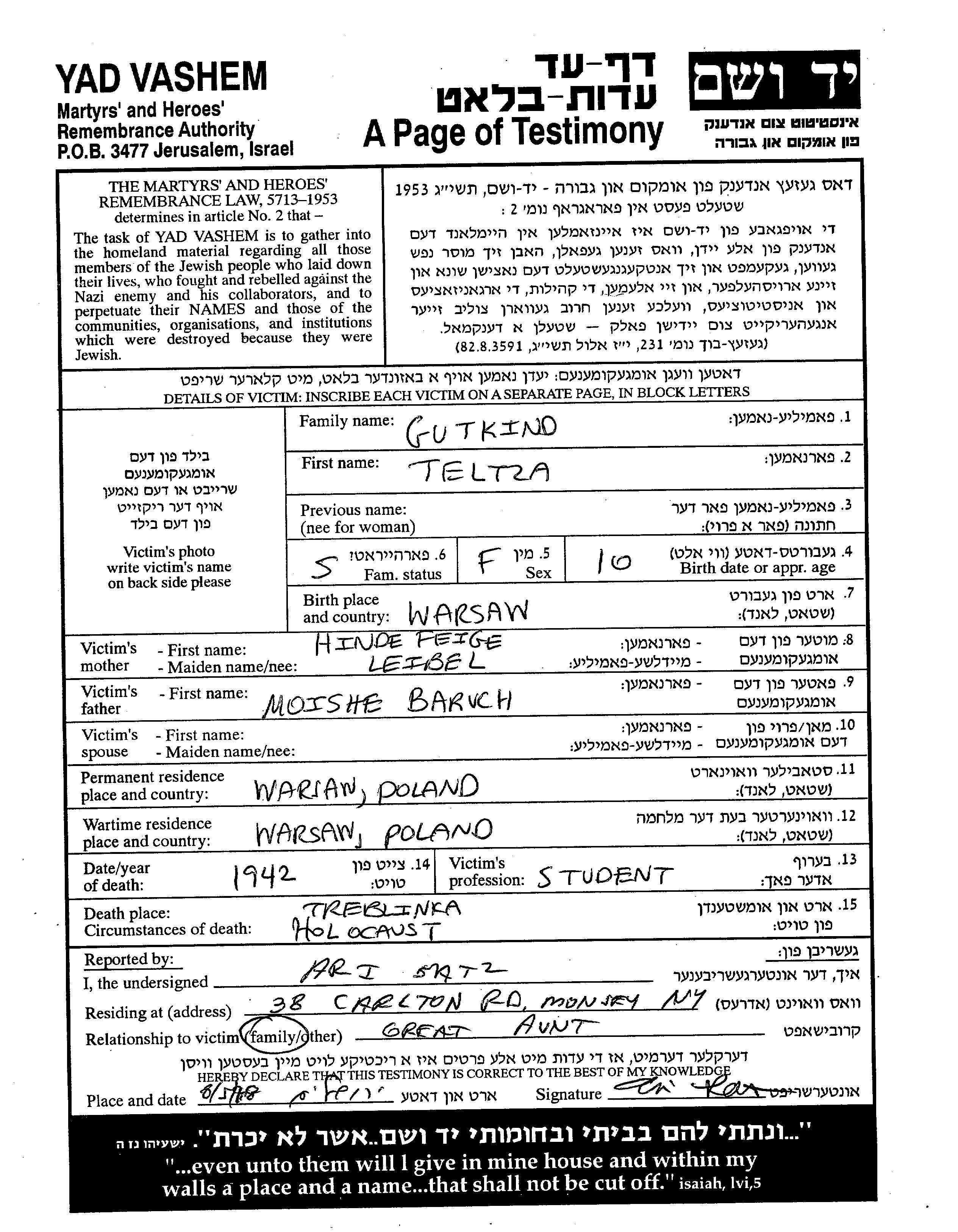 Teltza Gutkind wurde im Jahr 1910 in Warsaw, Polen geboren. Sie war die Tochter von Moishe Baruch und Hinde Feiga. Sie war Student. Vor dem Zweiten Weltkrieg lebte sie in Warsaw, Polen. Während des Krieges war sie in Warsaw, Polen.