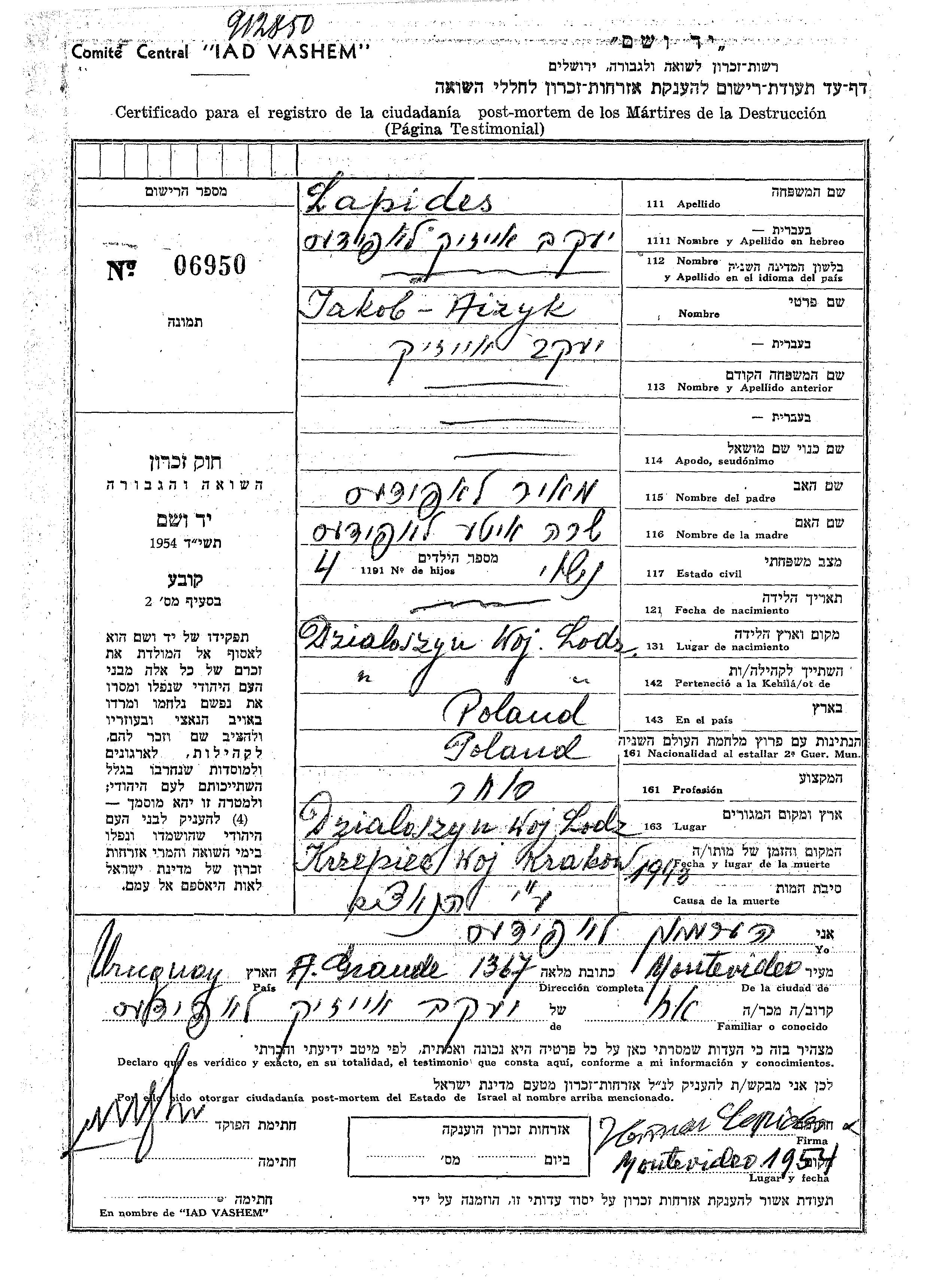 Jakob Aizyk Lapidus wurde in Lodz, Polen geboren. Er war der Sohn von Meir und Sara Ite. Er war Kaufmann/-frau und Verheiratet. Vor dem Zweiten Weltkrieg lebte er in Lodz, Polen. Während des Krieges war er in Lodz, Polen.