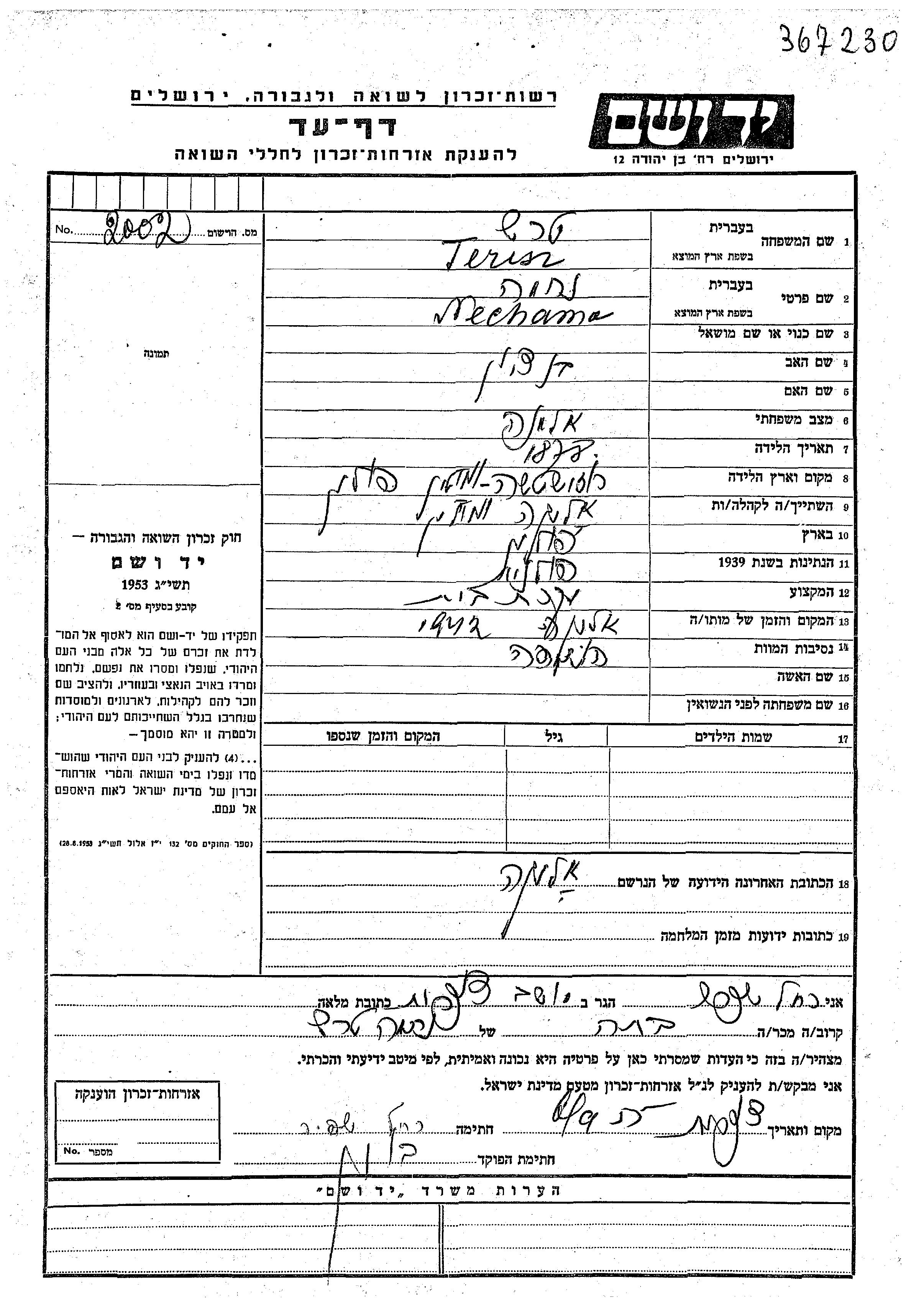 Nechama Teresz wurde im Jahr 1878 in Rozyszcze, Polen geboren. Sie war die Tochter von Bentzion. Sie war Hausfrau und Witwe. Vor dem Zweiten Weltkrieg lebte sie in Polen. Während des Krieges war sie in Alme, Italien.