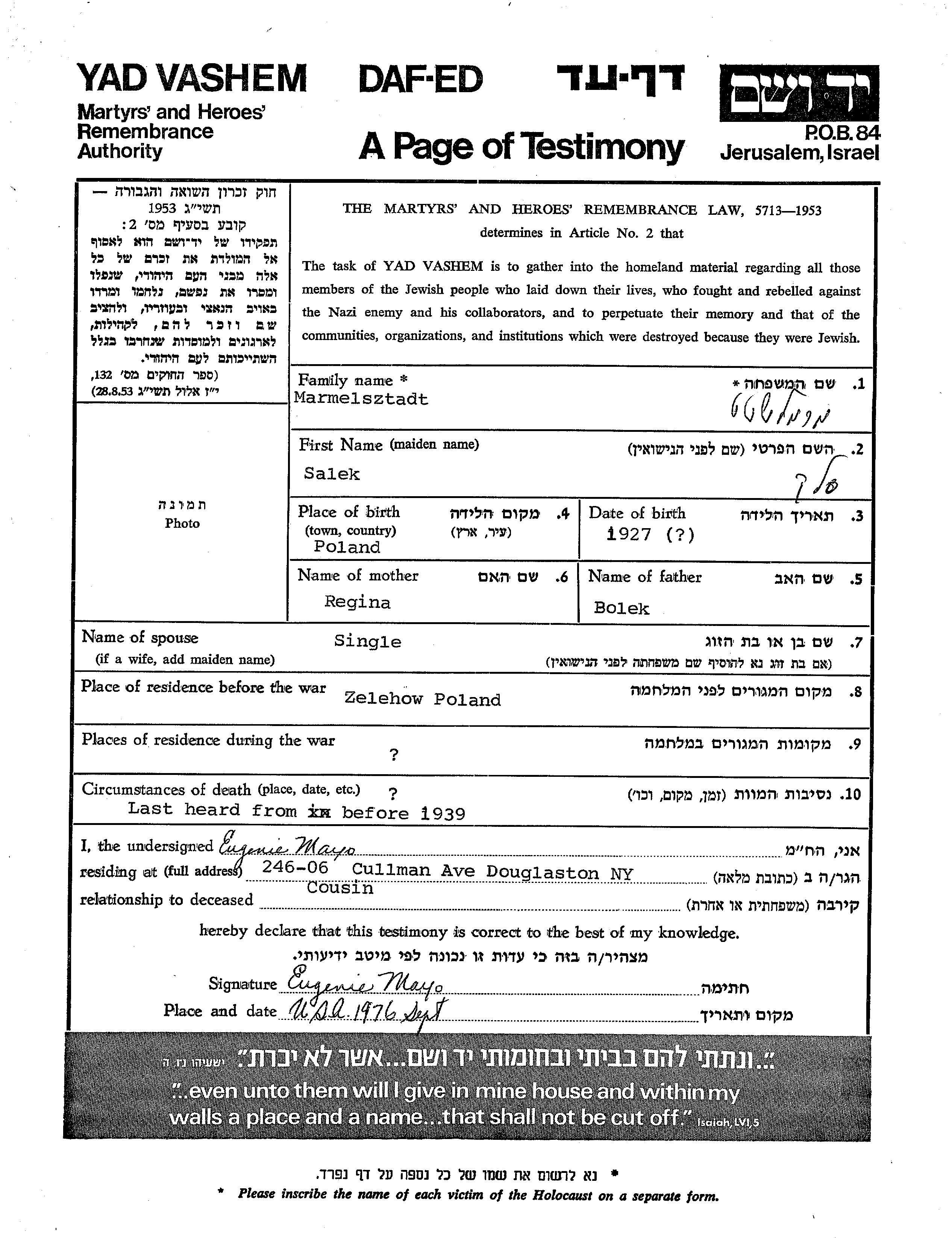 Salek Marmelsztadt wurde im Jahr 1927 in Polen geboren. Er war der Sohn von Bolek und Regina. Er war Ledig. Vor dem Zweiten Weltkrieg lebte er in Zelechow, Polen.