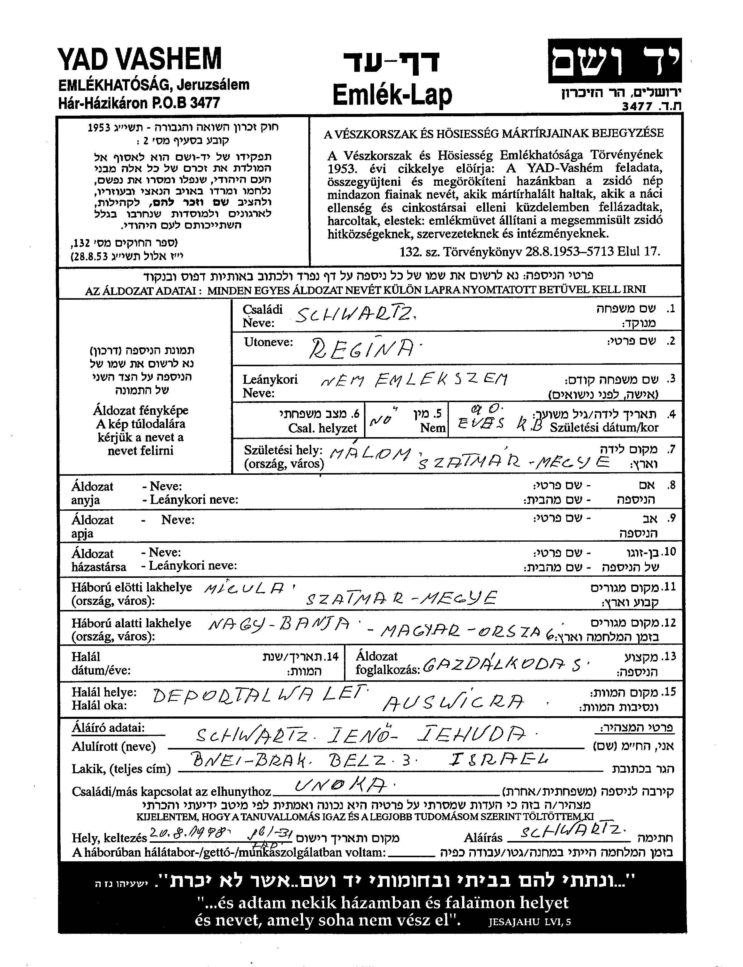 Regina Schwartz wurde in Szatmarnemeti, Rumänien geboren. Sie war Landwirt. Vor dem Zweiten Weltkrieg lebte sie in Szatmarnemeti, Rumänien. Während des Krieges war sie in Nagy Banya, Rumänien.