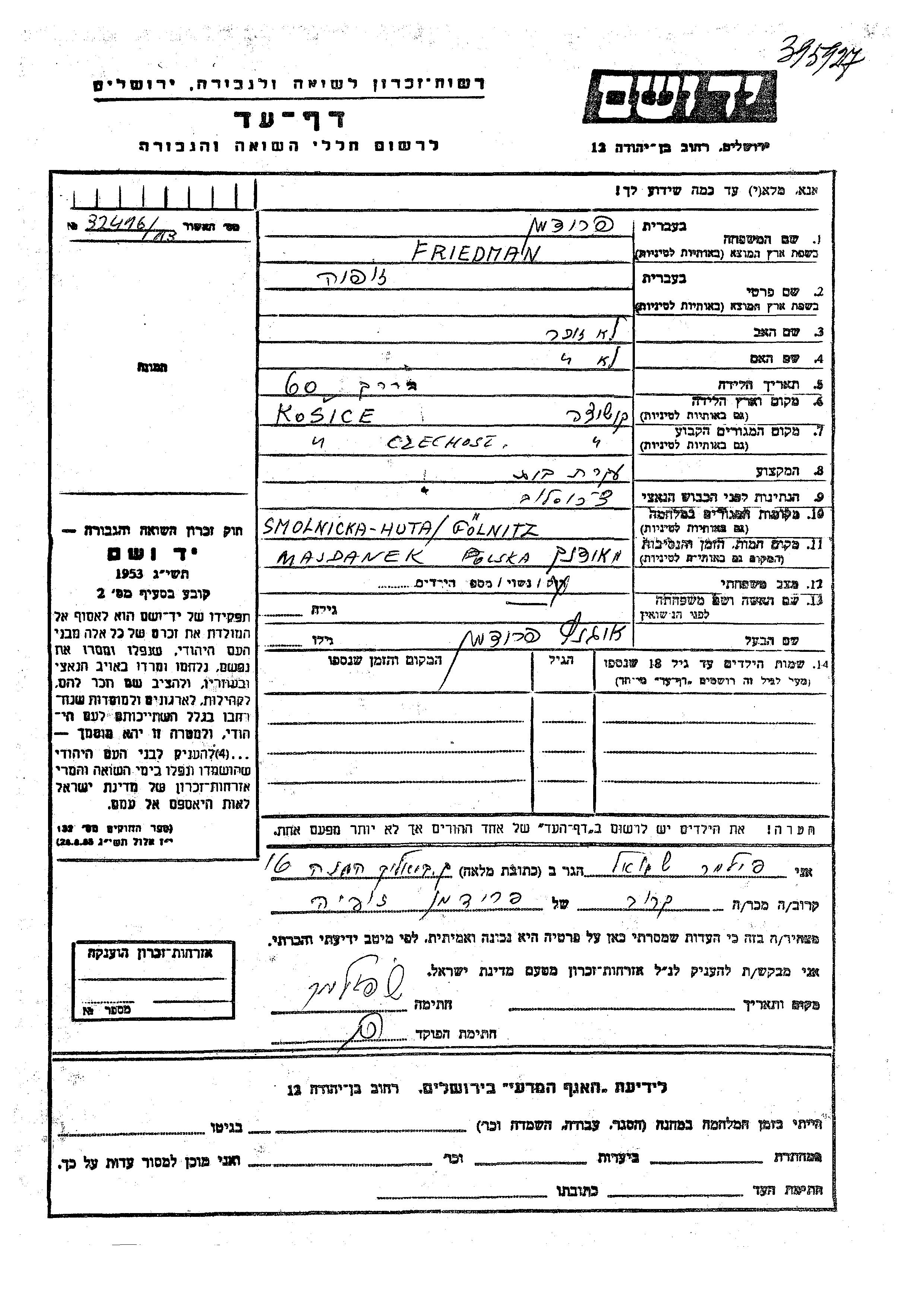 Zofia Fridman wurde in Kosice, Tschechoslowakei geboren. Sie war Hausfrau und mit Ignatz Verheiratet. Vor dem Zweiten Weltkrieg lebte sie in Kosice, Tschechoslowakei. Während des Krieges war sie in Smolnicka Hutta, Tschechoslowakei.