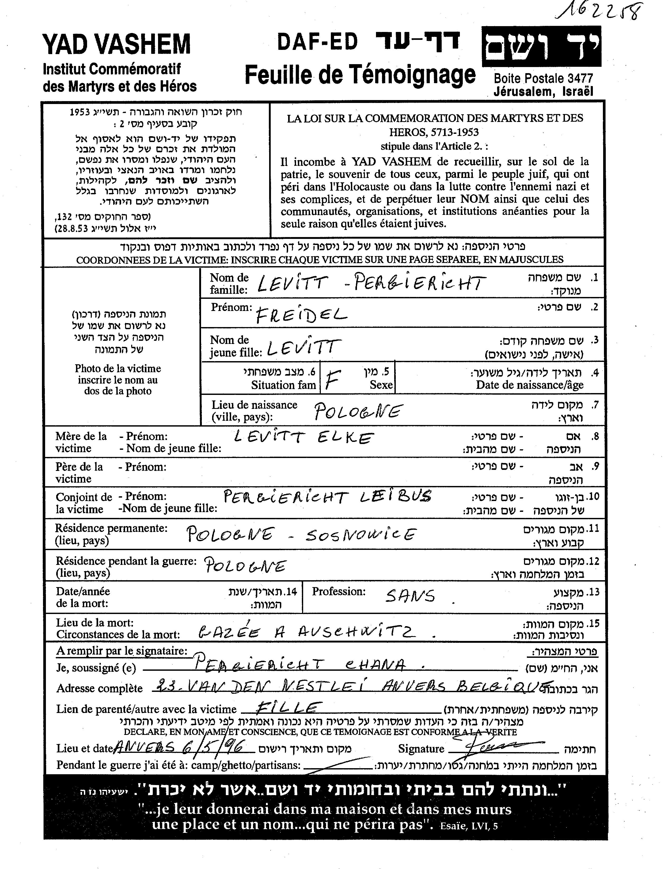 Freidel Pergiericht, geb. Levitt wurde in Polen geboren. Sie war die Tochter von Elke, geb. Levitt. Sie war mit Leibus Verheiratet. Vor dem Zweiten Weltkrieg lebte sie in Sosnowiec, Polen. Während des Krieges war sie in Sosnowiec, Polen.