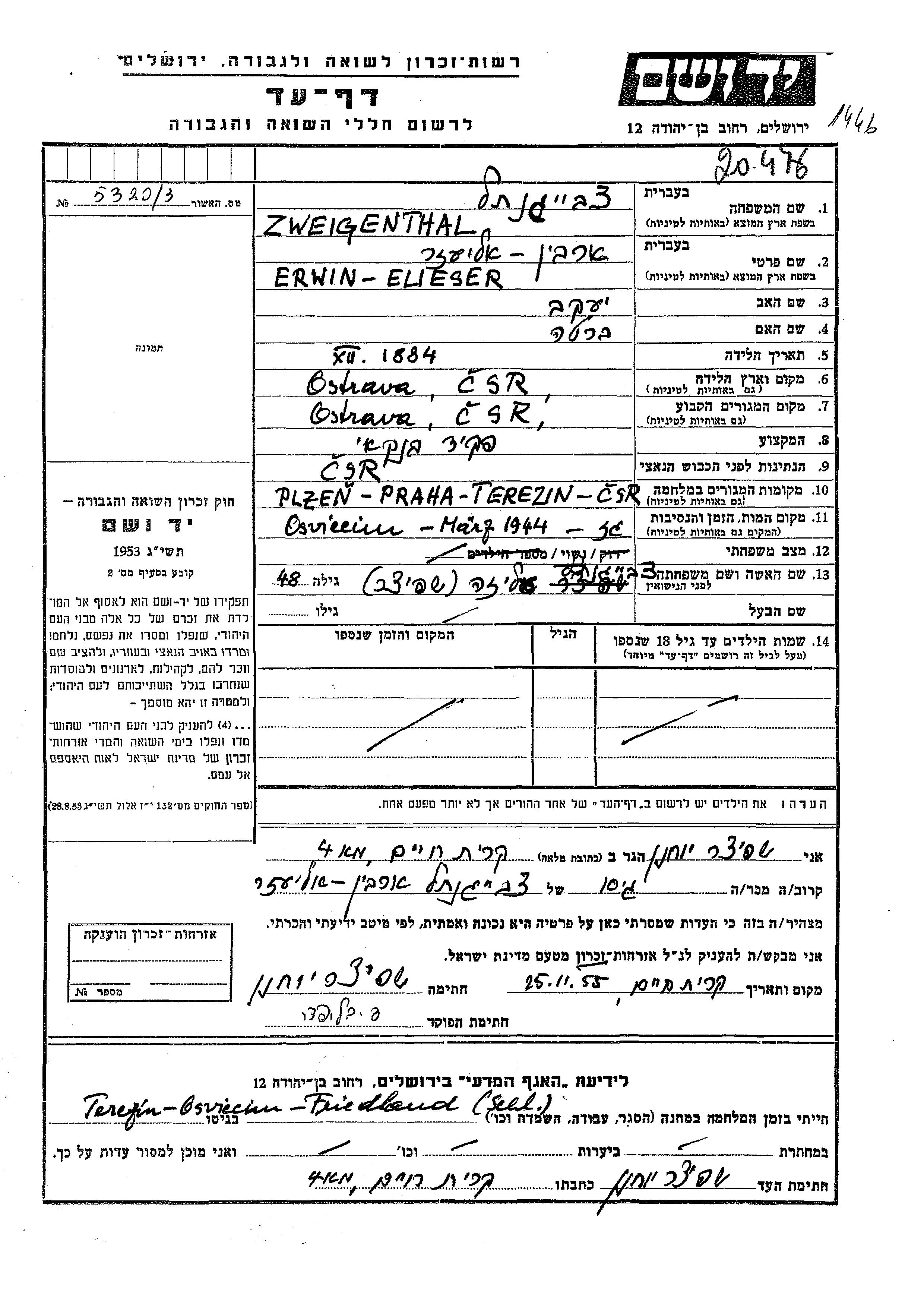 Erwin Elieser Zweigenthal Shpitzer wurde im Jahr 1884 in Ostrava, Tschechoslowakei geboren. Er war der Sohn von Yaakov und Berta. Er war Bankangestellte/-r und mit Aliza, geb. Fitzer Verheiratet. Vor dem Zweiten Weltkrieg lebte er in Ostrava, Tschechoslowakei. Während des Krieges war er in Praha, Tschechoslowakei.