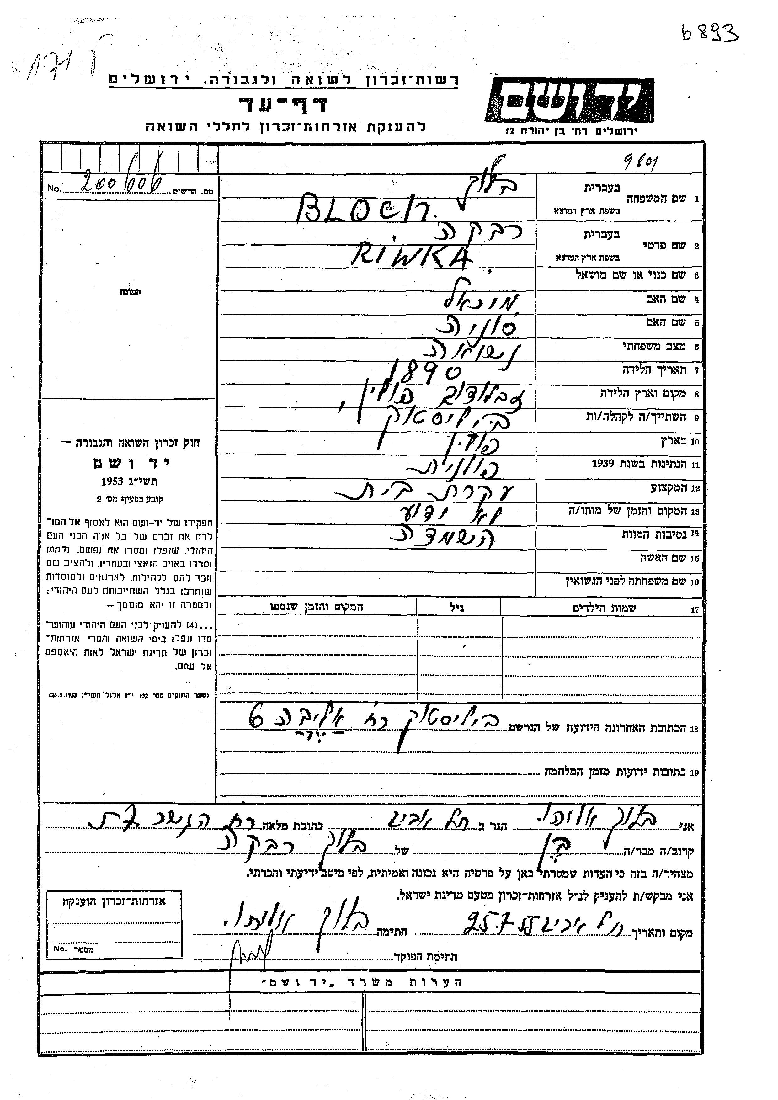 Riwka Bloch wurde im Jahr 1890 geboren. Sie war die Tochter von Mikhael und Sonia. Sie war Hausfrau und Verheiratet.