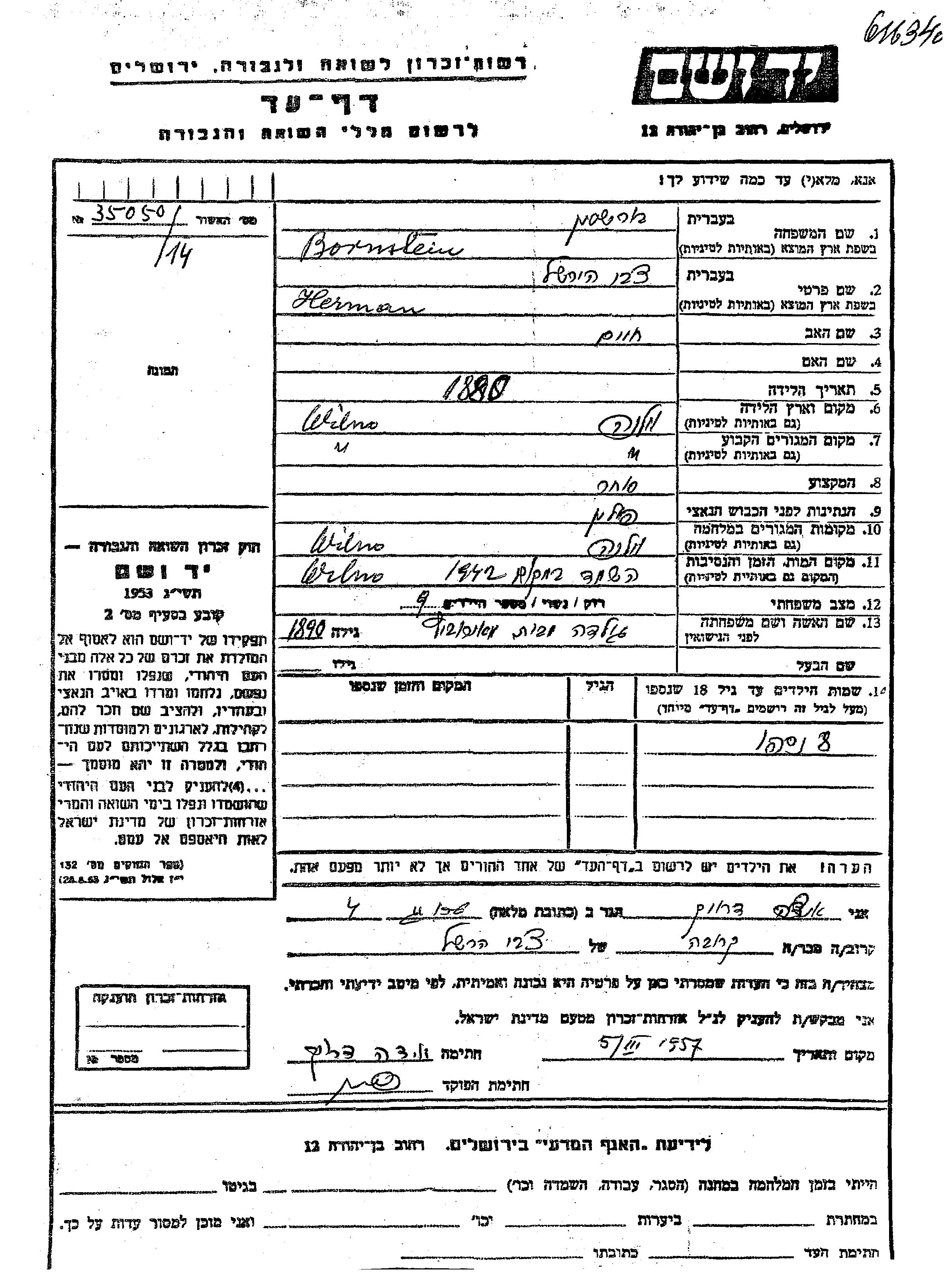 Tzvi Hirshel Herman Bornstein Burshtin wurde im Jahr 1890 in Wilno, Polen geboren. Er war der Sohn von Khaim. Er war Kaufmann/-frau und mit Golda, geb. Meirovitz Verheiratet. Vor dem Zweiten Weltkrieg lebte er in Wilno, Polen. Während des Krieges war er in Wilno, Polen.