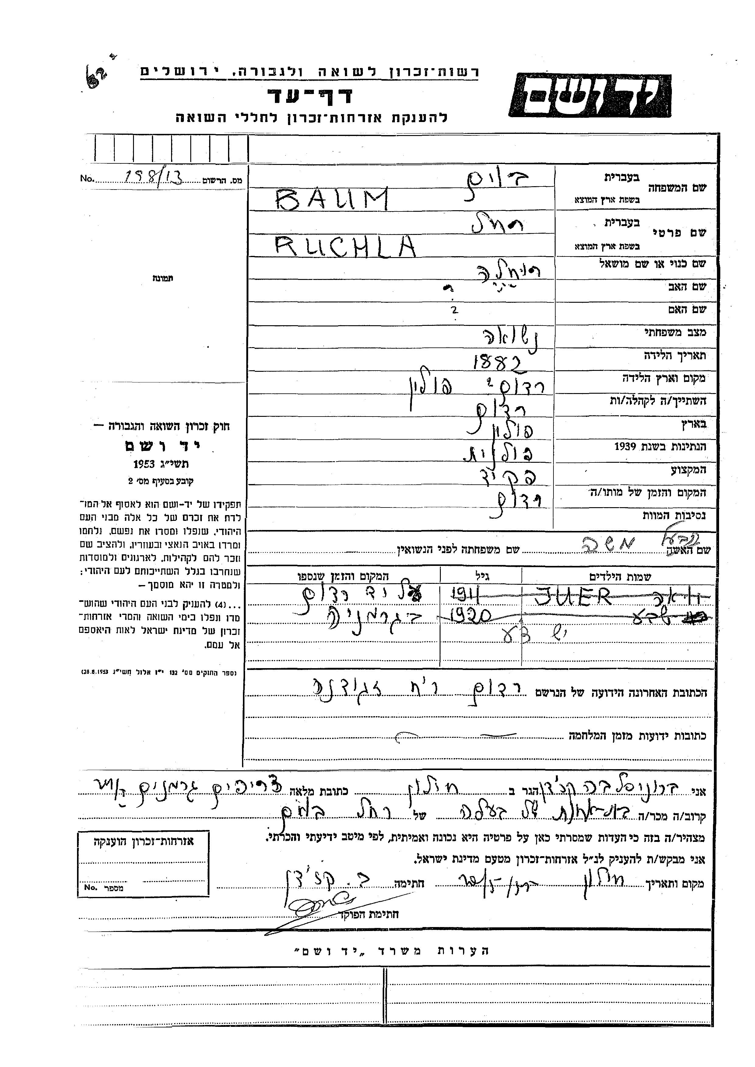 Ruchla Baum wurde im Jahr 1882 in Radom, Polen geboren. Sie war Angestellte/-r und mit Moshe Verheiratet. Vor dem Zweiten Weltkrieg lebte sie in Radom, Polen. Während des Krieges war sie in Radom, Polen.