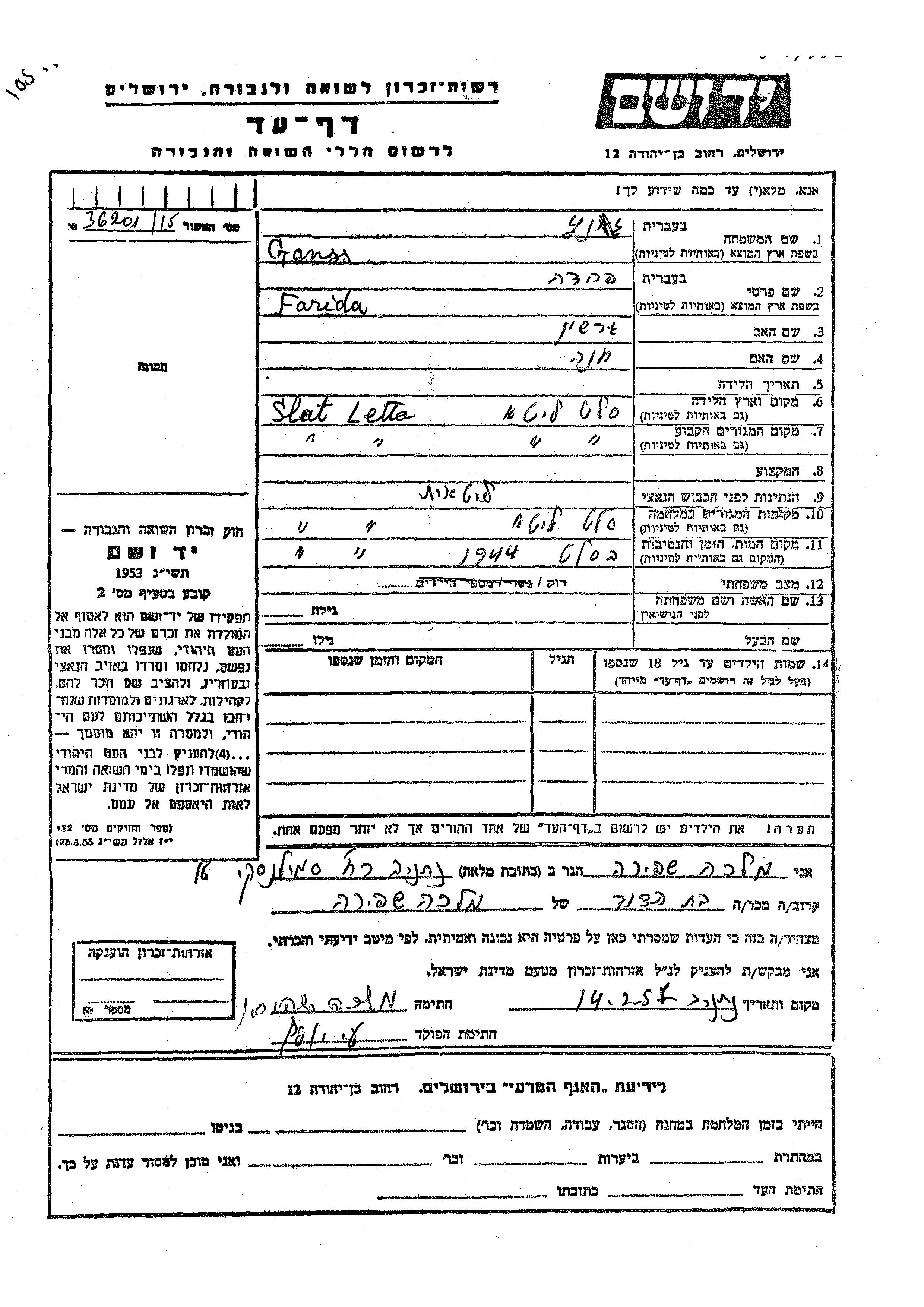 Farida wurde in der Schoah ermordet. Todesort: Slat, Litauen im Jahr 1944.