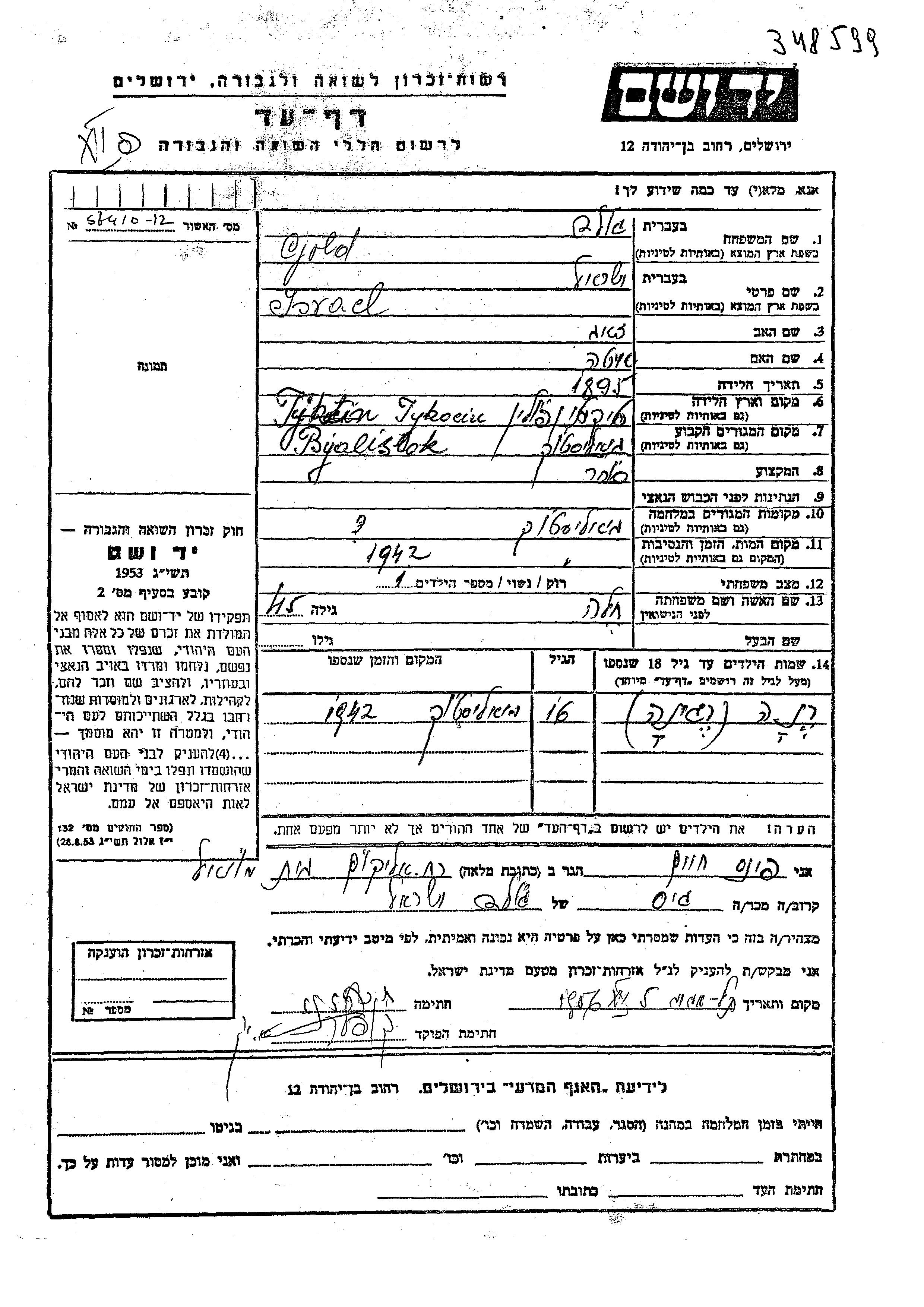 Ysrael wurde in der Schoah ermordet. Todesort: Bialistok, Polen im Jahr 1942.