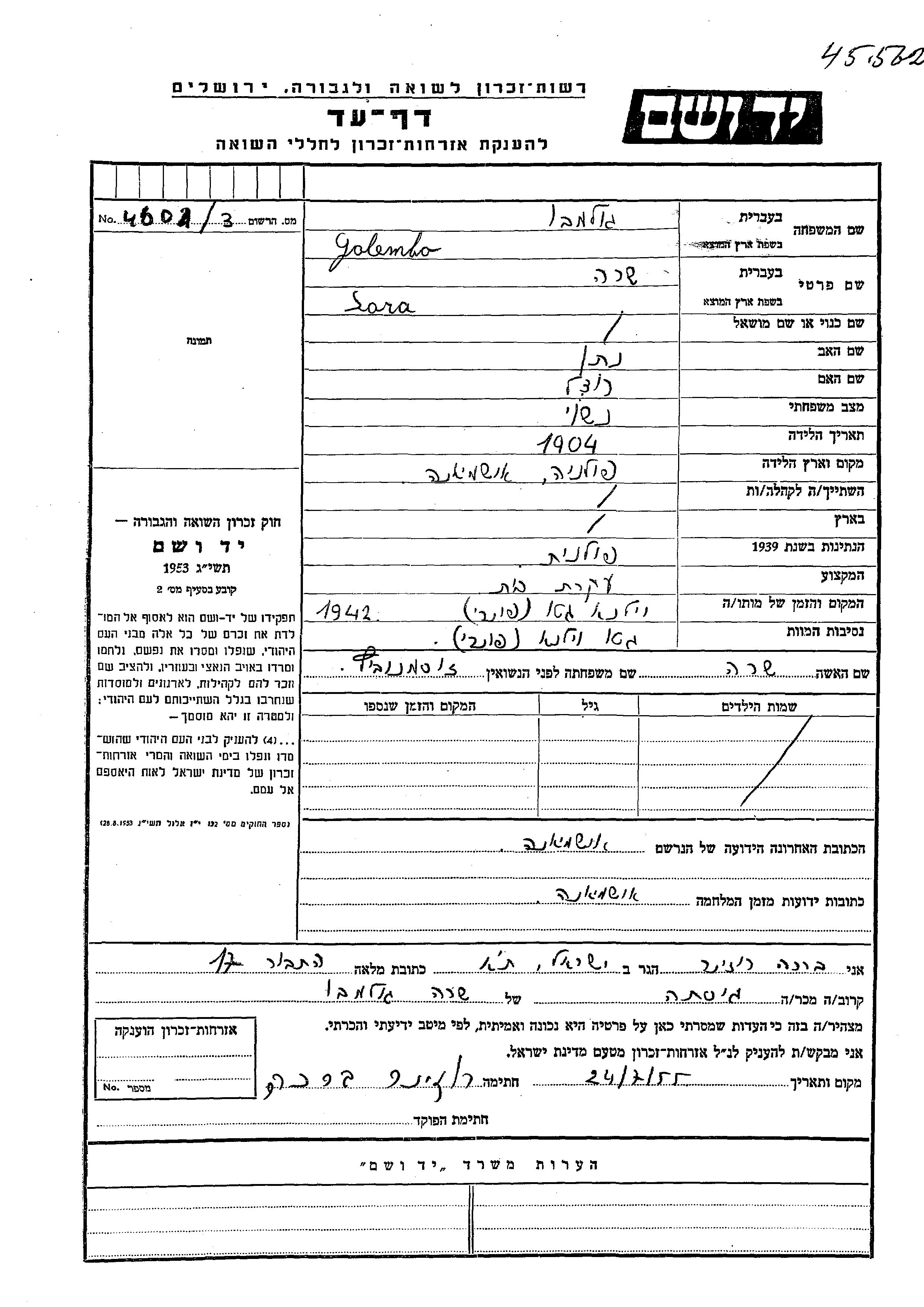Sara Golembo, geb. Zusmanovitz wurde im Jahr 1904 in Oszmiana, Polen geboren. Sie war die Tochter von Natan und Rudel. Sie war Hausfrau und mit Sara Verheiratet. Während des Krieges war sie in Oszmiana, Polen.