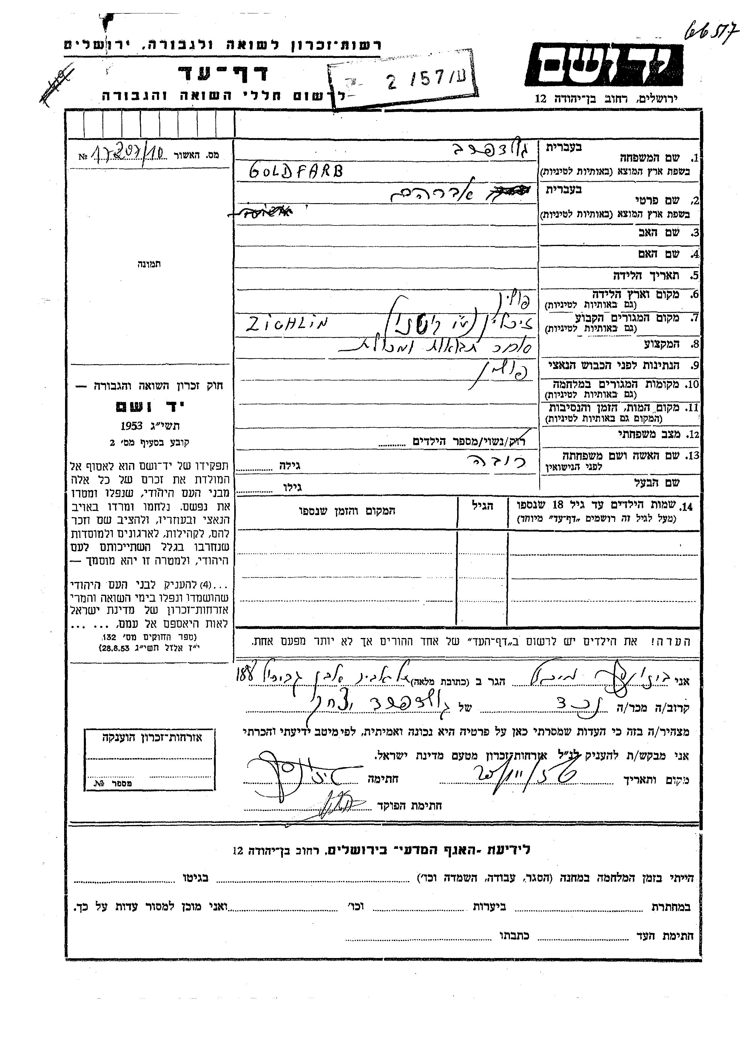 Avraham Goldfarb wurde in Polen geboren. Er war Getreidehändler/-in. Vor dem Zweiten Weltkrieg lebte er in Zichlin, Polen.