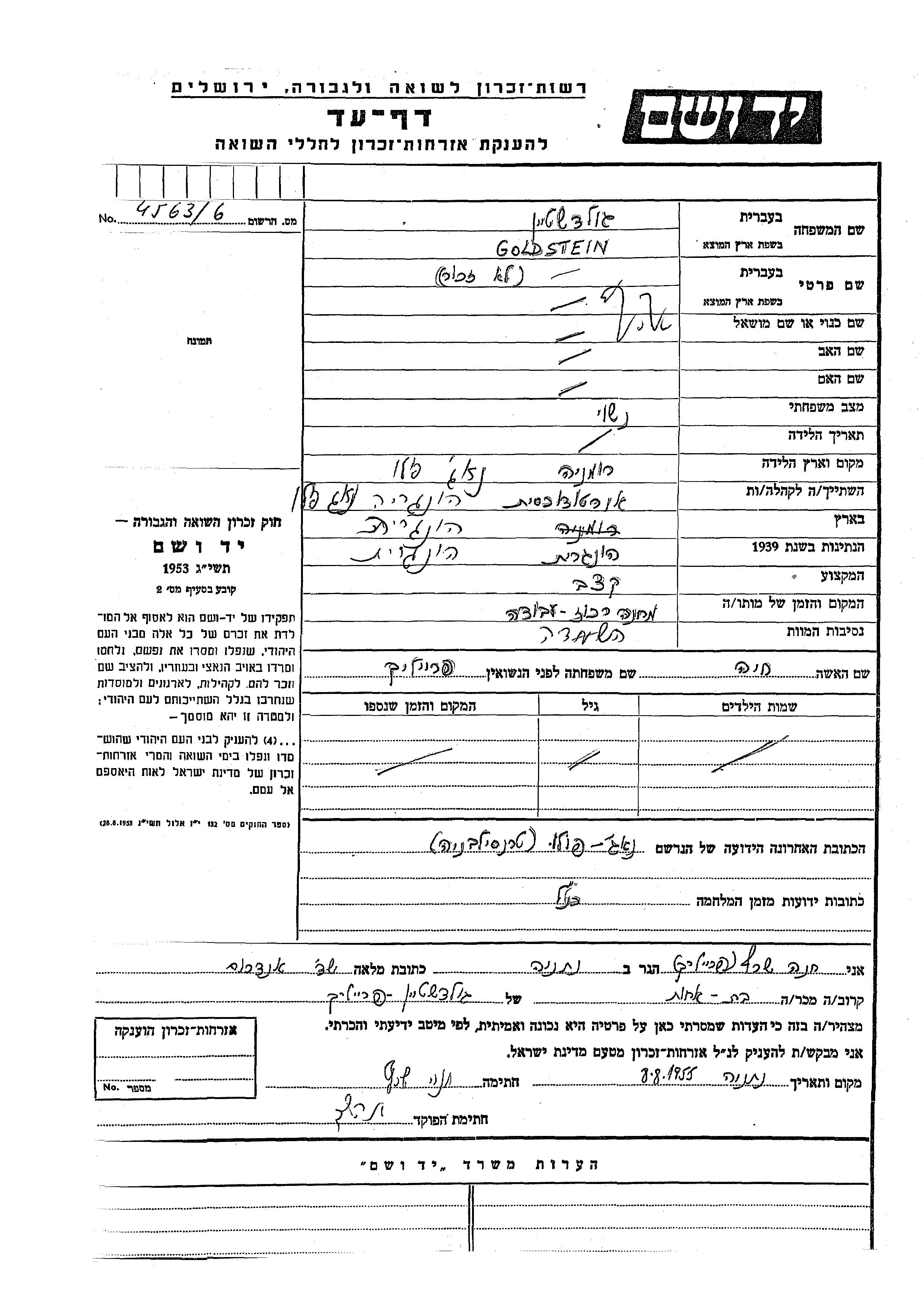 Vorname unbekannt Goldstein wurde in Nagy Falu, Rumänien geboren. Er war Metzger/-in. Vor dem Zweiten Weltkrieg lebte er in Nagy Falu, Rumänien. Während des Krieges war er in Nagy Falu, Rumänien.