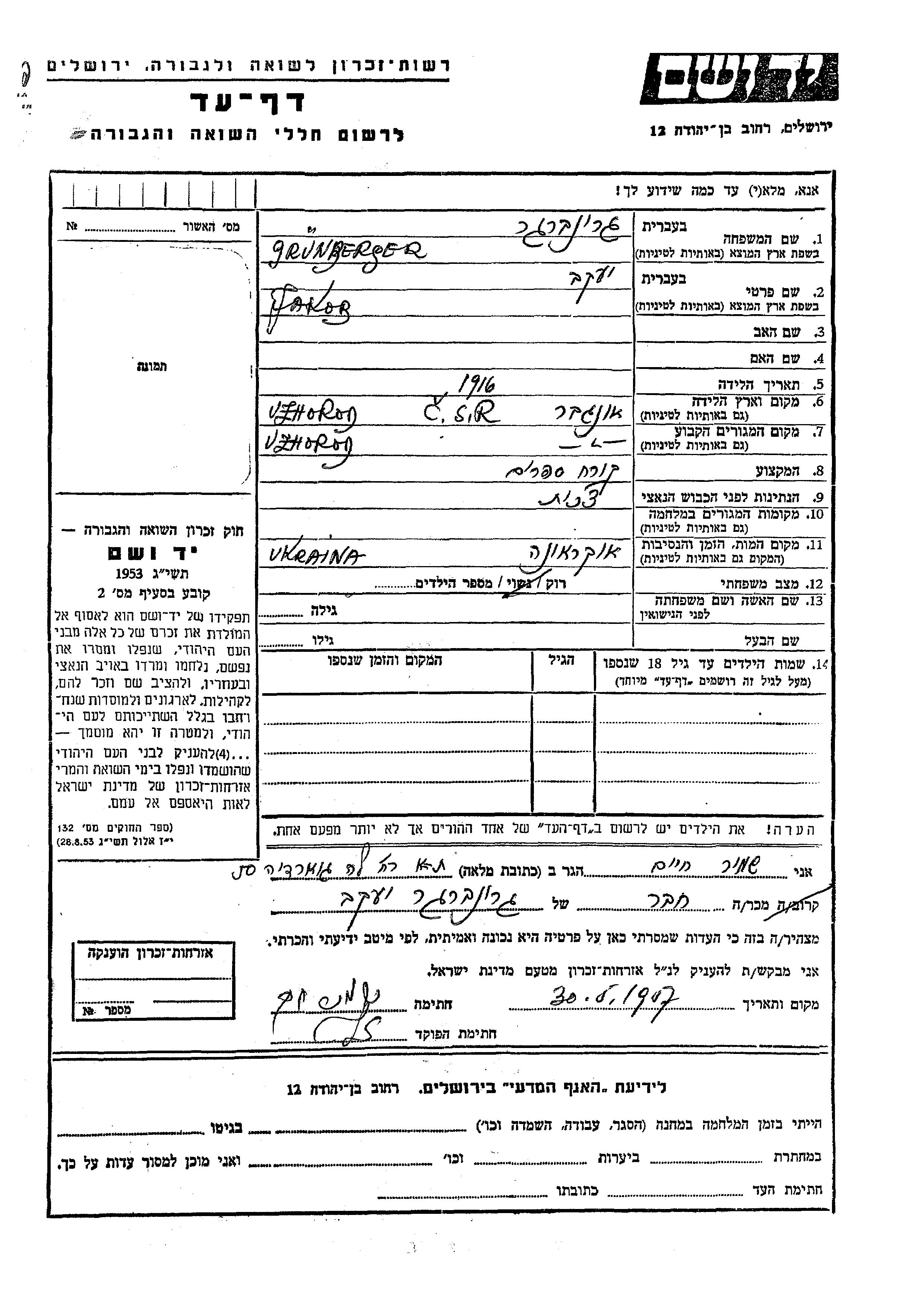 Jakob Grünberger wurde im Jahr 1916 in Uzhorod, Tschechoslowakei geboren. Er war Buchbinder und Ledig. Vor dem Zweiten Weltkrieg lebte er in Uzhorod, Tschechoslowakei.