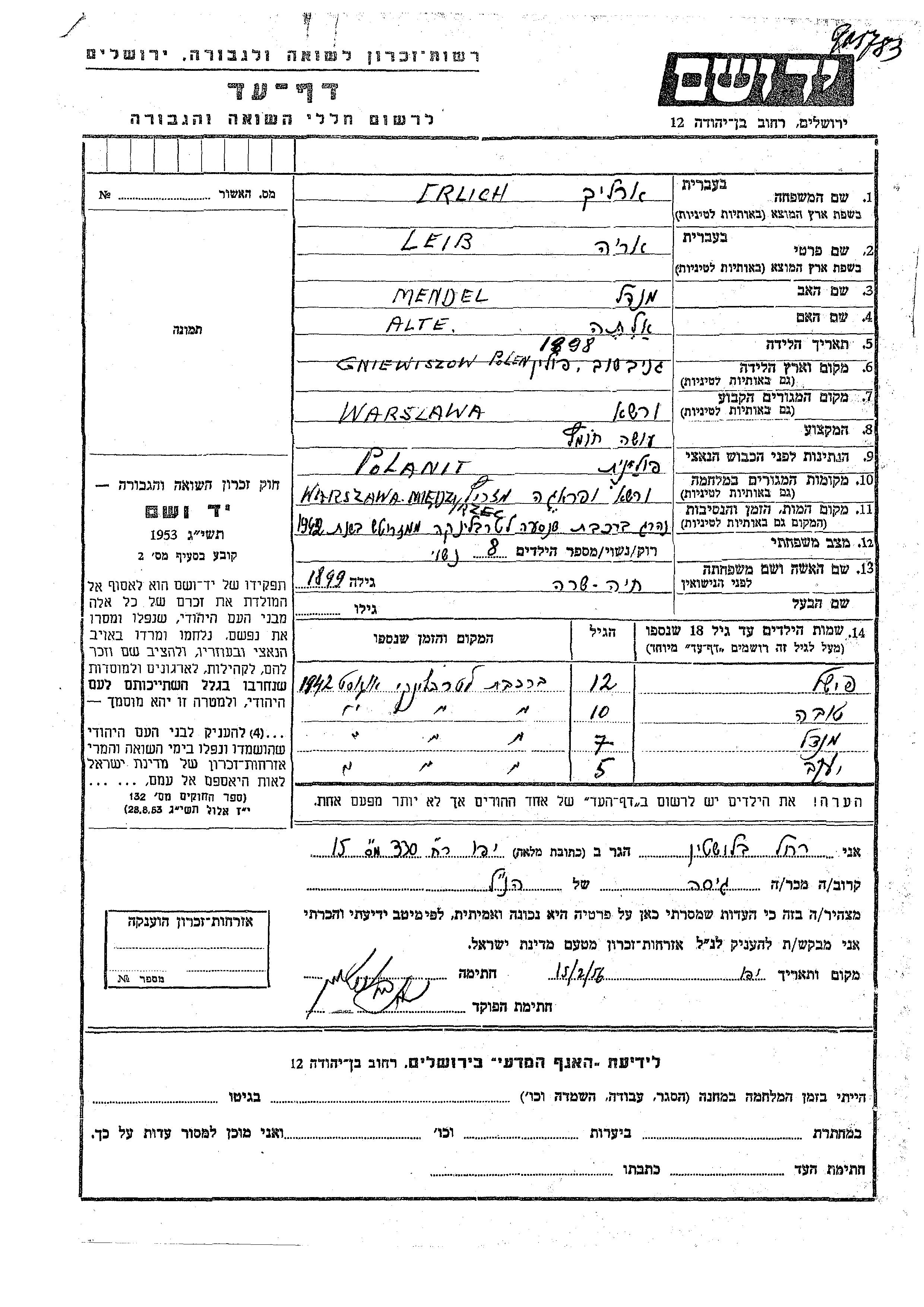 Leib Arie Erlich wurde im Jahr 1898 in Gniewoszow, Polen geboren. Er war der Sohn von Mendel und Alta. Er war עושה חומץ und mit Khaia Sara Verheiratet. Vor dem Zweiten Weltkrieg lebte er in Warszawa, Polen. Während des Krieges war er in Warszawa, Polen.