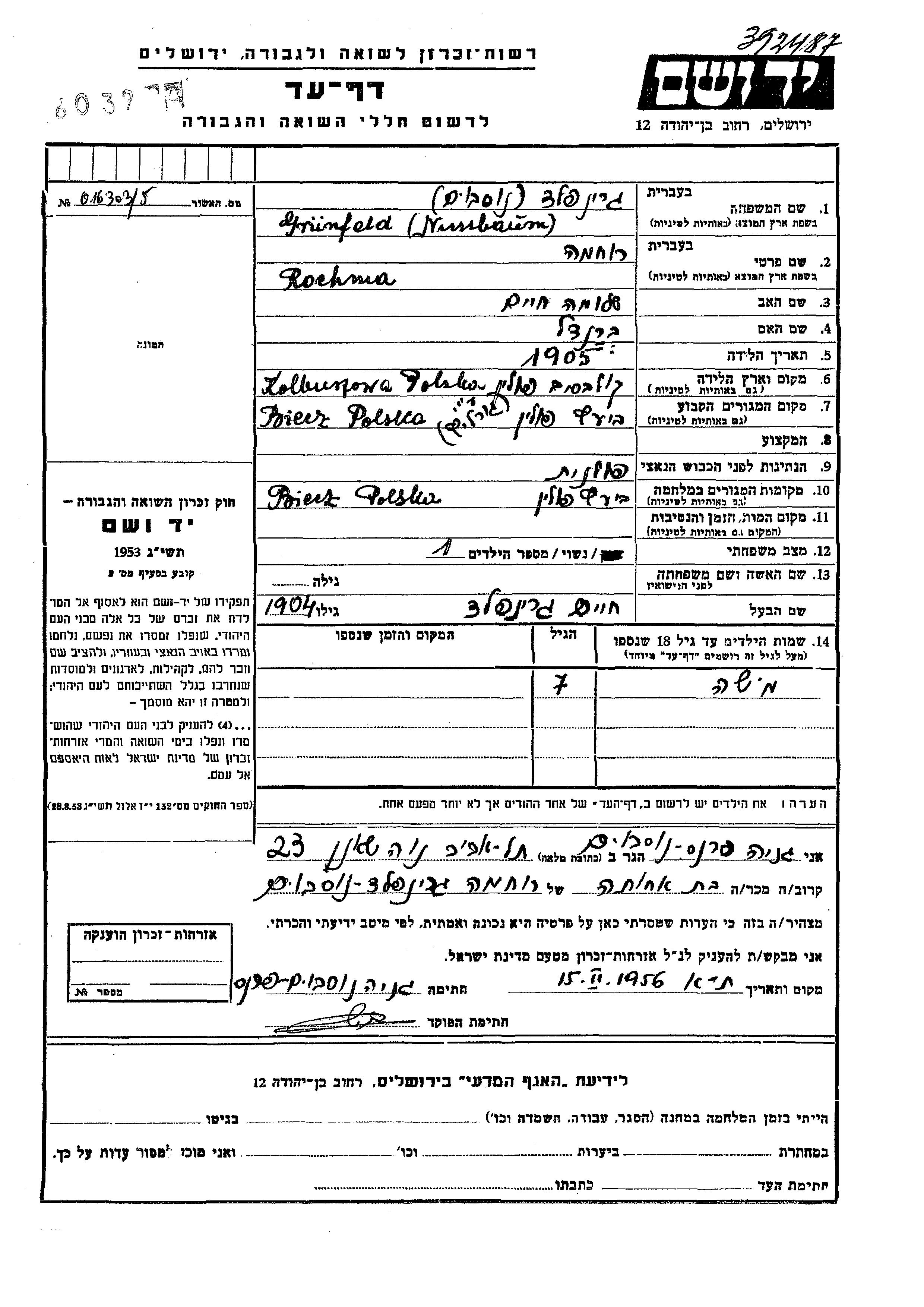 Rochma Grinfeld, geb. Nußbaum wurde im Jahr 1905 in Kolbuszowa, Polen geboren. Sie war die Tochter von Shlomo Khaim und Brandel. Sie war mit Khaim Verheiratet. Vor dem Zweiten Weltkrieg lebte sie in Biecz, Polen. Während des Krieges war sie in Biecz, Polen.