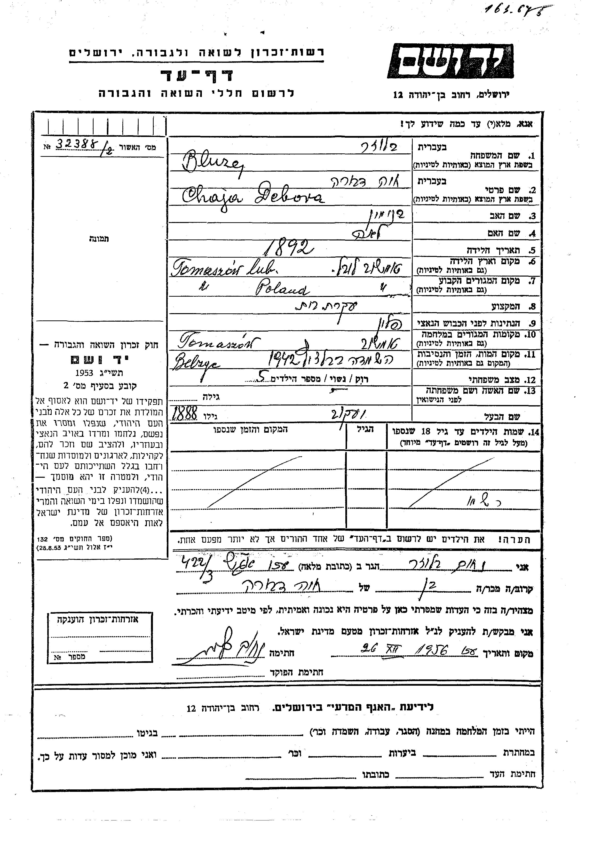 Chaja Debora Bluzer wurde im Jahr 1892 in Tomaszov, Polen geboren. Sie war die Tochter von Beniamin und Lea. Sie war Hausfrau und mit Yaakov Verheiratet. Vor dem Zweiten Weltkrieg lebte sie in Tomaszow Lubelski, Polen. Während des Krieges war sie in Tomaczow Mazowiecki, Polen.