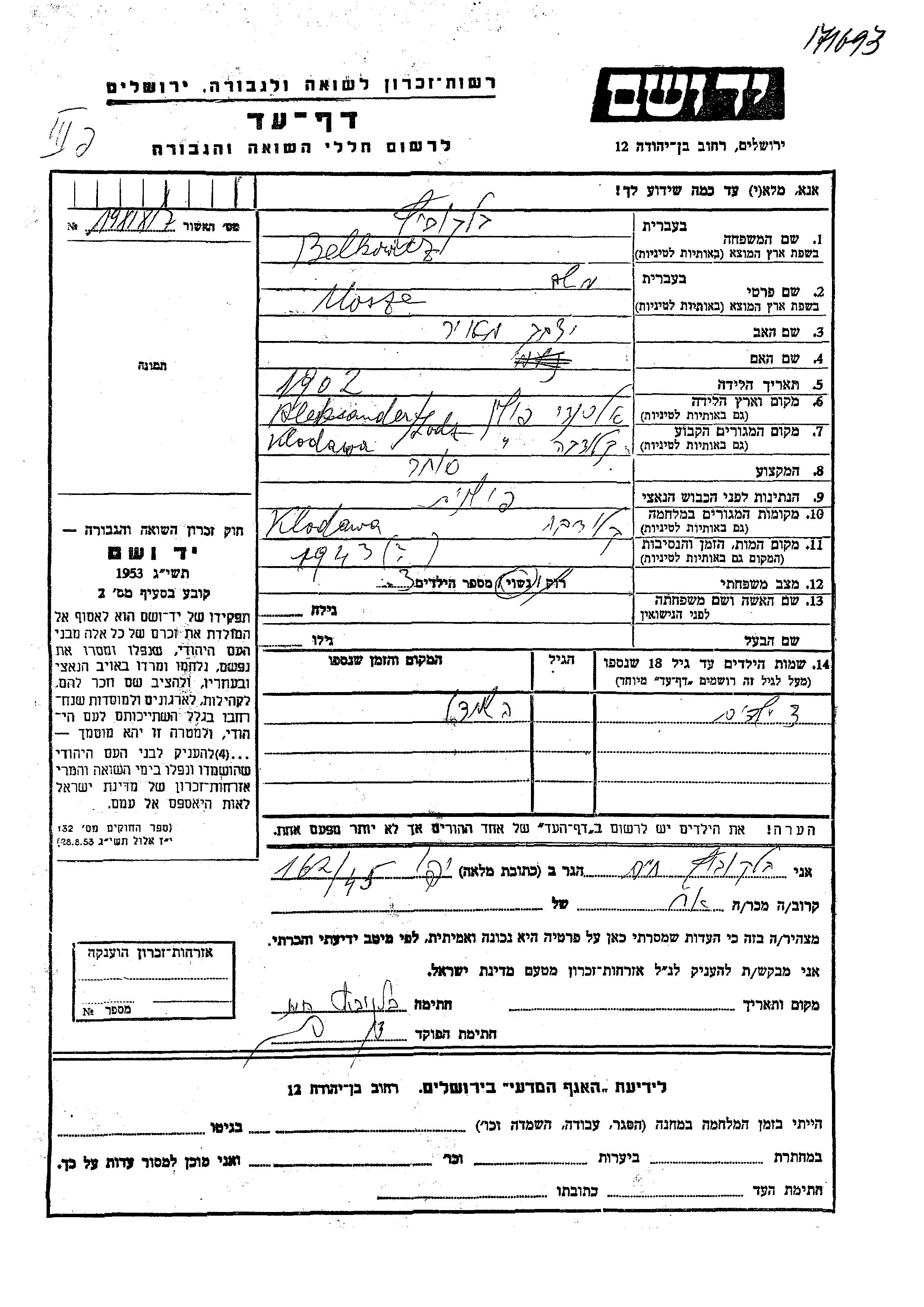 Mose Belkowicz wurde im Jahr 1902 in Aleksander, Polen geboren. Er war der Sohn von Yitzkhak Meir. Er war Kaufmann/-frau und Verheiratet. Vor dem Zweiten Weltkrieg lebte er in Klodawa, Polen. Während des Krieges war er in Kloda, Polen.