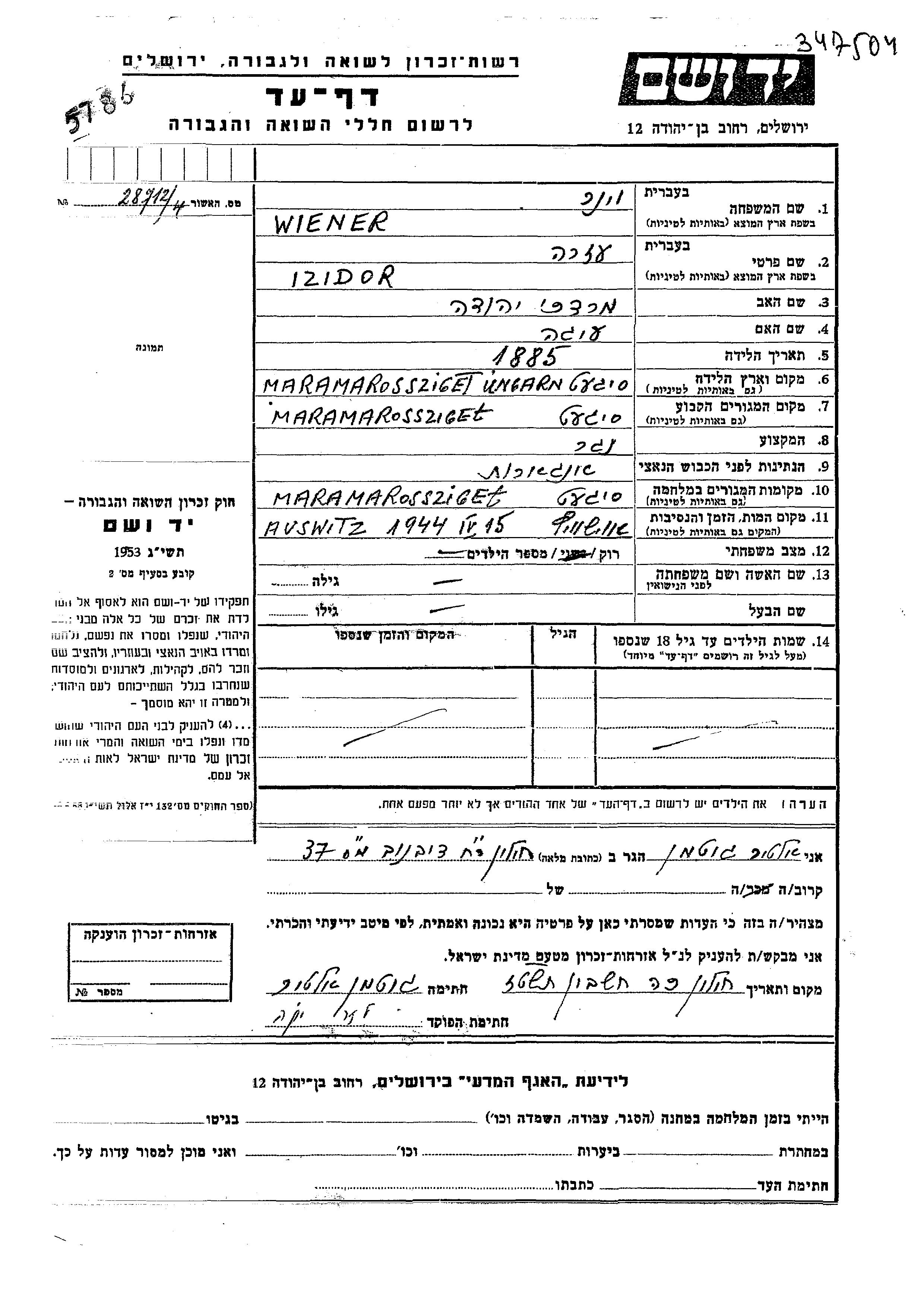 Ezra Izidor Wiener wurde im Jahr 1885 in Maramaros Sighet, Rumänien geboren. Er war der Sohn von Mordekhai Yehuda und Eiga. Er war Zimmermann und Verheiratet. Vor dem Zweiten Weltkrieg lebte er in Maramaros Sighet, Rumänien. Während des Krieges war er in Maramaros Sighet, Rumänien.