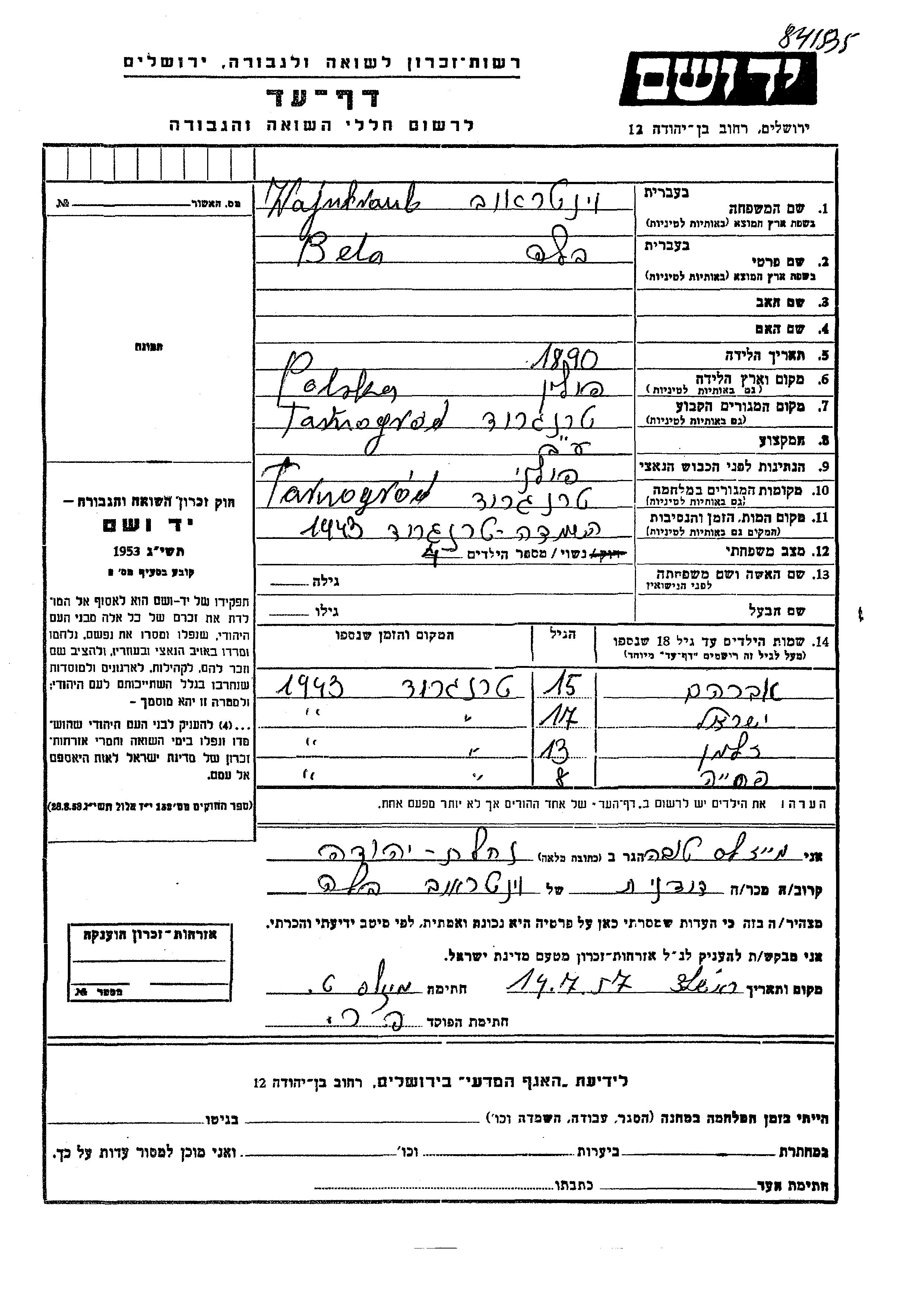 Bela wurde in der Schoah ermordet. Todesort: Tarnogrod, Polen im Jahr 1943.